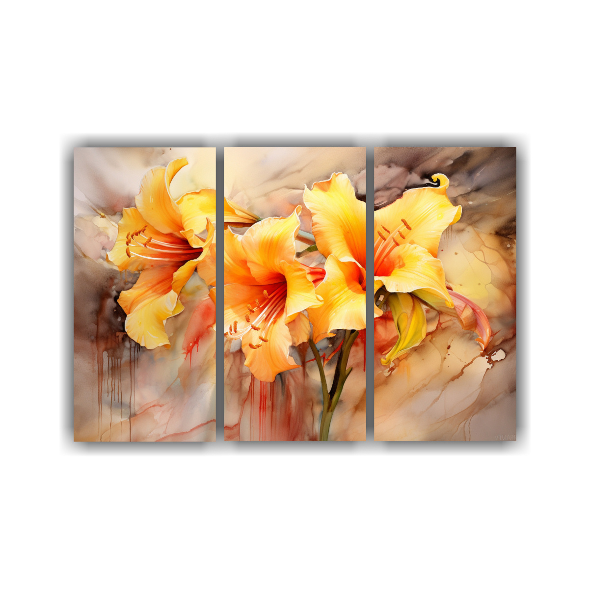Para resaltar la belleza de estos cuadros, te recomendamos colocarlos en una pared blanca o neutra, permitiendo que los colores Oro y Amarillo resalten Complementa con muebles en tonos neutros y detalles en coral o anaranjado para un ambiente equilibrado y sofisticado