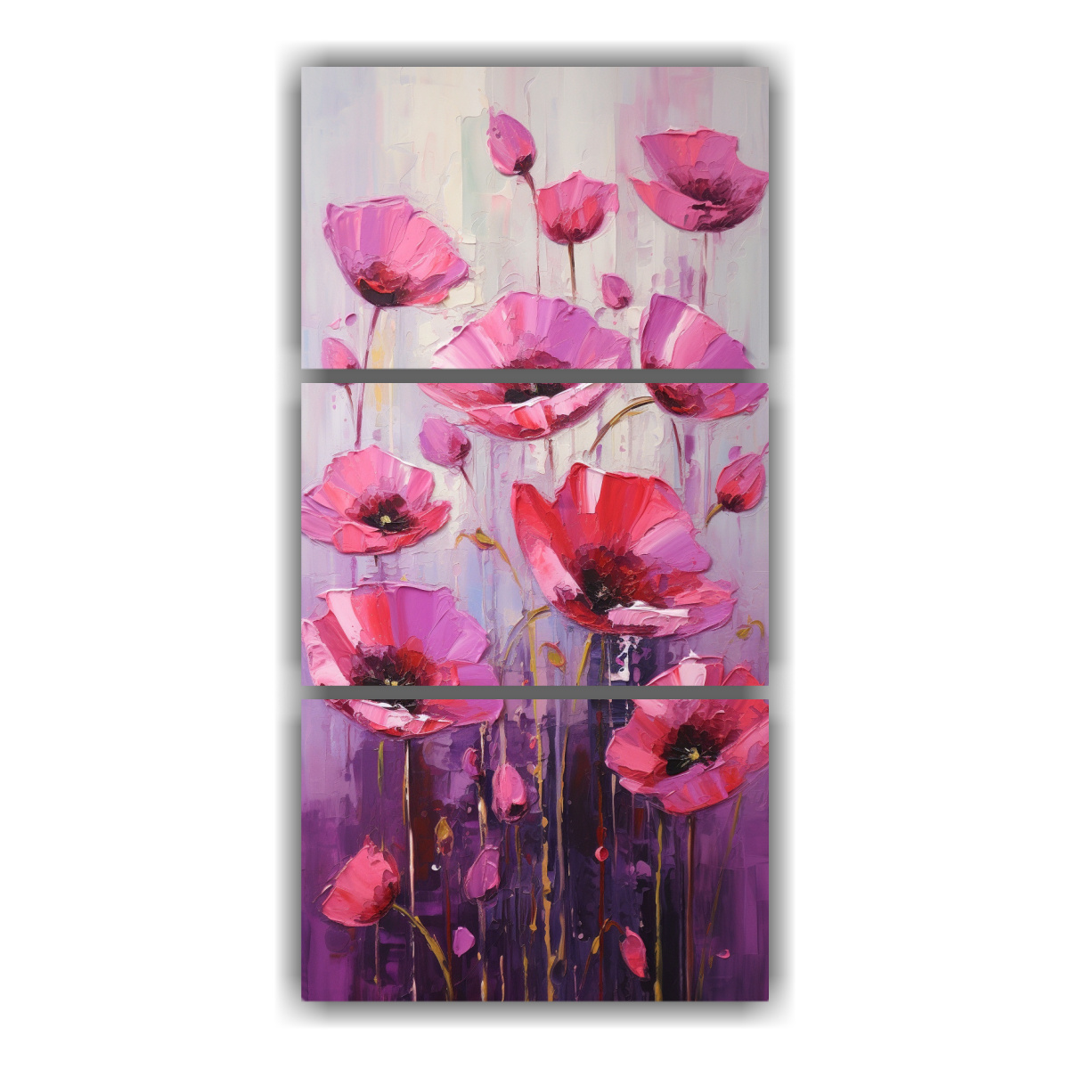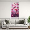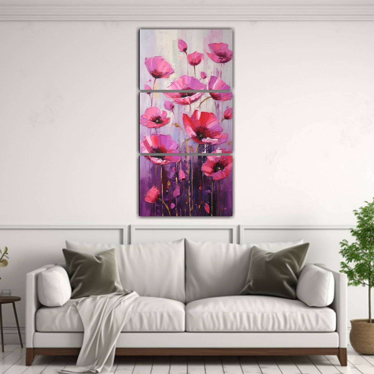 Este vibrante cuadro estrellado con flores magenta en lienzo sería ideal para colocar en la sala de estar sobre un sofá gris claro, creando un contraste elegante Combínalo con cojines en tonos beige y coral para una decoración armoniosa