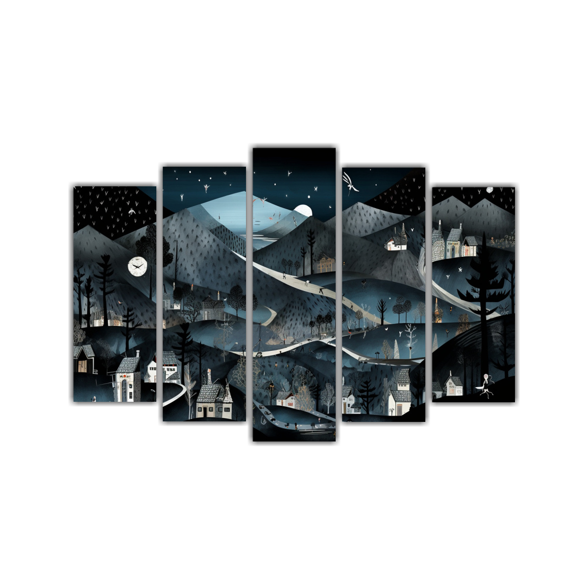 DecoCuadros te ofrece un set de 5 lienzos de tela con un diseño estilo Tim Burton en tonos negro, plateado, gris, turquesa, azul marino grisáceo y carmesí Calidad premium a precios económicos