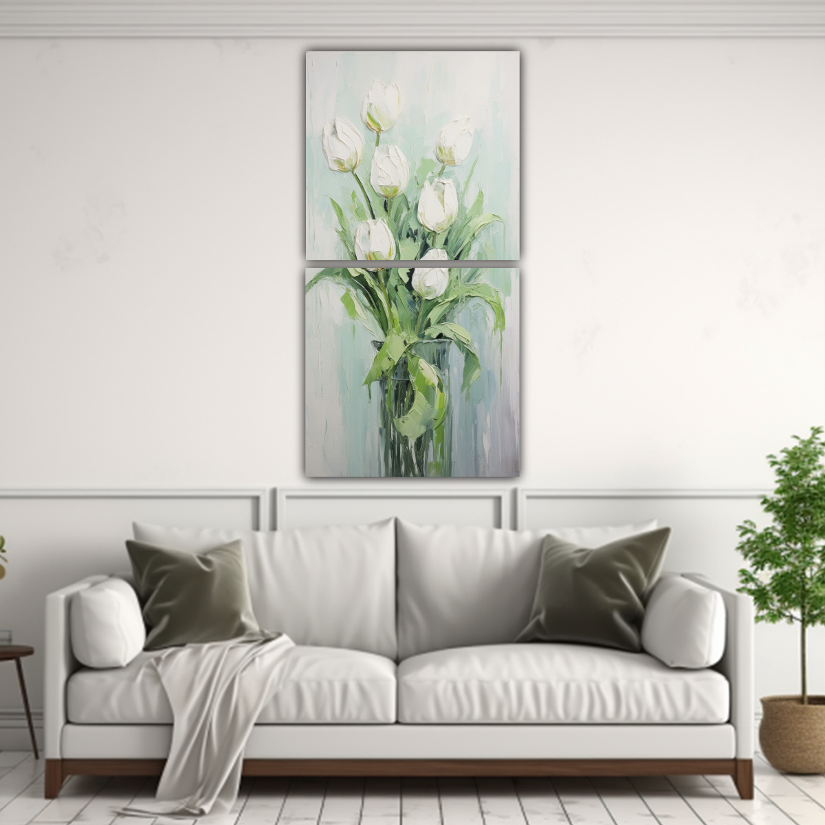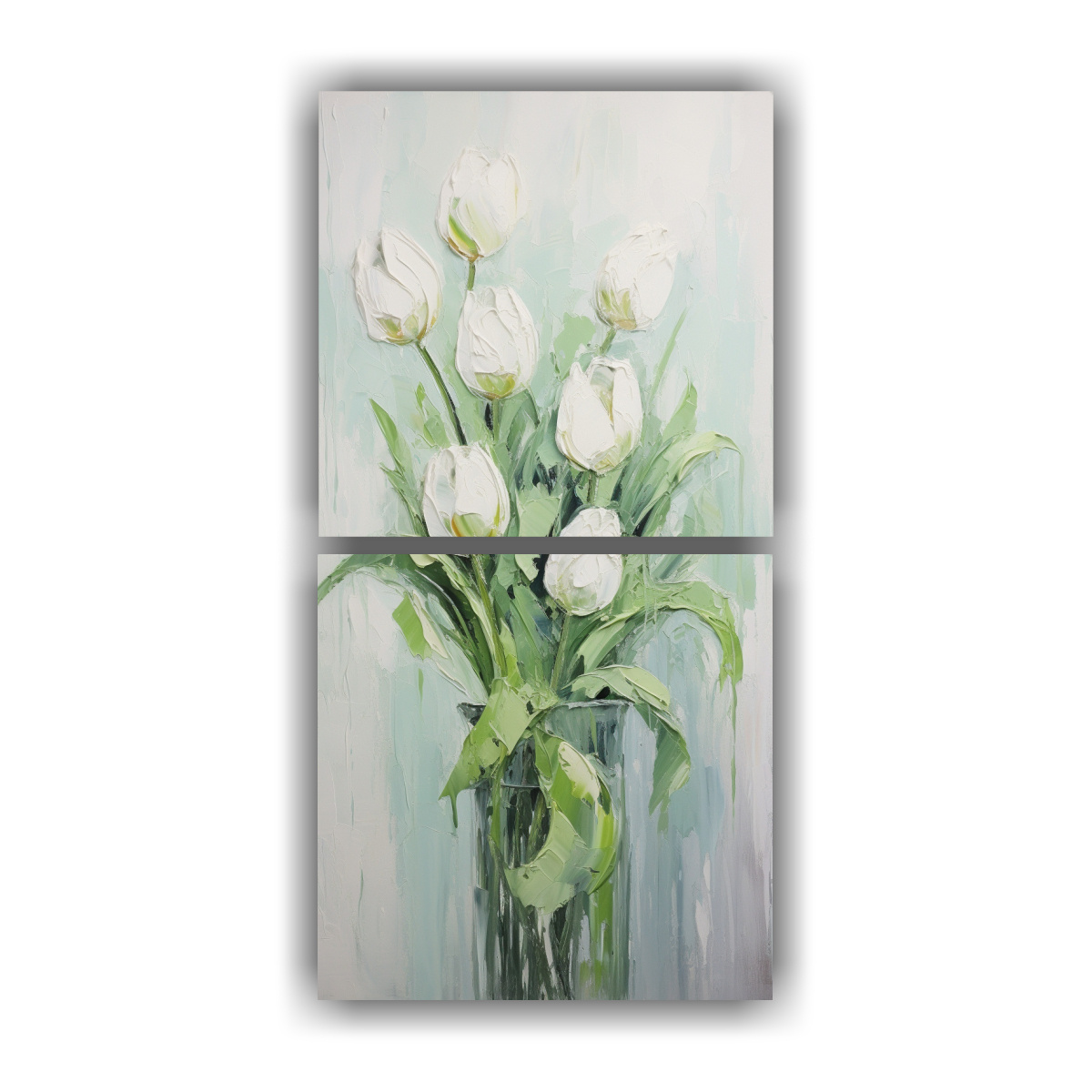 Este cuadro de TULIPANES verdes en lienzo es ideal para decorar un salón o sala de estar moderno Colócalo encima de un sofá gris o beige para crear un contraste elegante Combínalo con cojines en tonos plateados y dorados para resaltar los colores del cuadro ¡Dale un toque de sofisticación a tu espacio con este cuadro exclusivo de DecoCuadros!