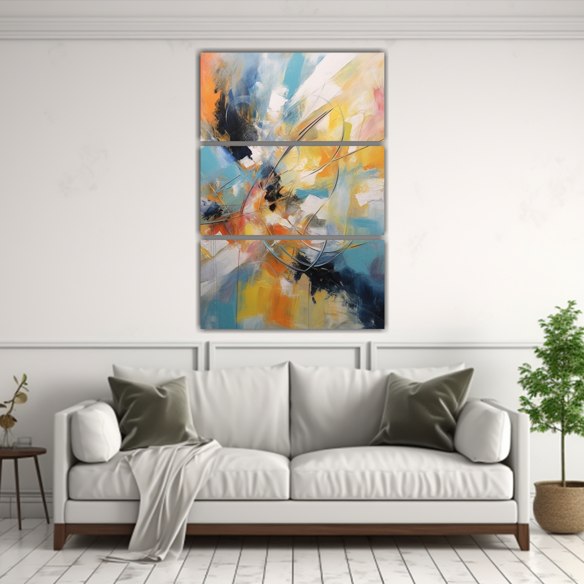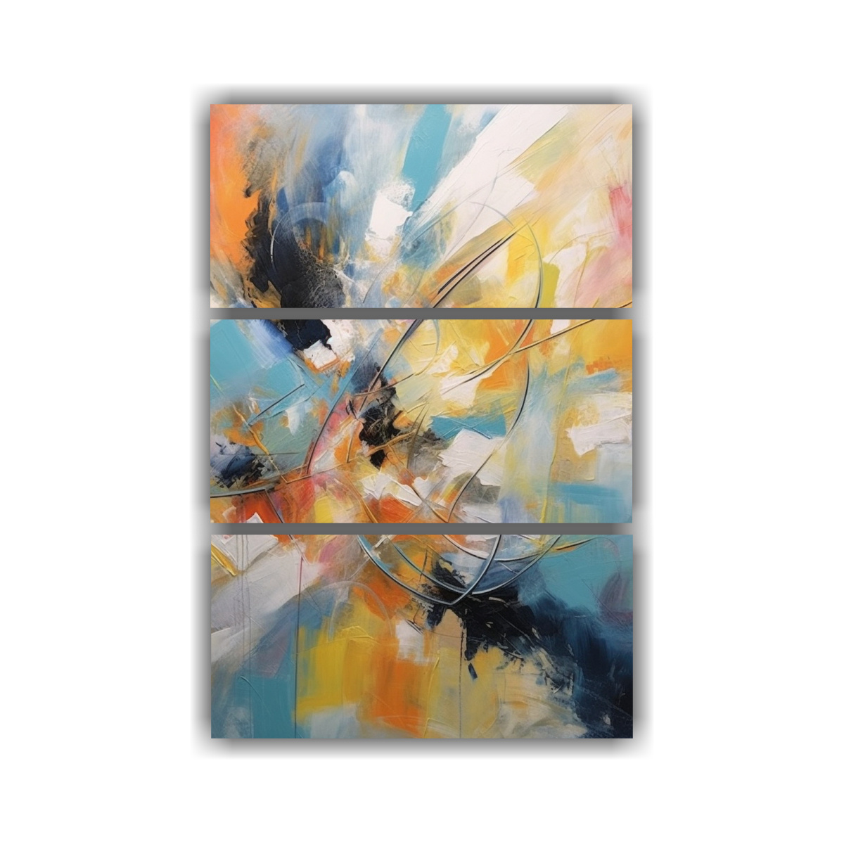 Este cuadro abstracto en tonos dorados, azules y naranjas es ideal para decorar tu sala de estar o tu dormitorio Combínalo con muebles en tonos neutros, como beige o gris, para crear un ambiente equilibrado y elegante Colócalo sobre un sofá o una cama para crear un punto focal y darle vida a la habitación
