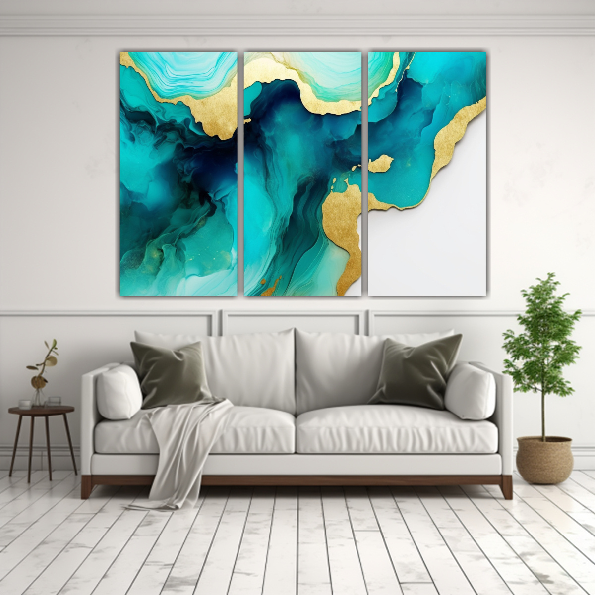 Coloca este conjunto de cuadros en tu sala de estar para crear un ambiente moderno y sofisticado Combina los tonos verde azulado, coral y turquesa con cojines y elementos decorativos en tonos beige y gris para lograr una decoración equilibrada y elegante