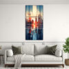 Una idea para decorar con este cuadro es colocarlo en el salón principal de tu hogar, justo encima del sofá La vista de la ciudad y la luz matutina reflejada en el cuadro brindará un ambiente relajante y energético a la vez Combínalo con muebles en tonos neutros como el blanco, beige o gris, y agrega cojines en colores turquesa y coral para resaltar los colores del cuadro Completa la decoración con plantas naturales y accesorios en tonos dorado y plateado para darle un toque de elegancia ¡Disfruta de un espacio único y lleno de estilo con este cuadro inspirador de DecoCuadros!