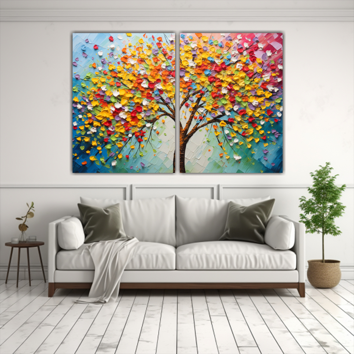 Coloca estos cuadros en la sala de estar junto a muebles blancos y accesorios en tonos turquesa y mostaza para lograr una decoración moderna y juvenil ¡Aporta alegría y color a tu ambiente con estos Cuadros A Rainbow linden flowers!
