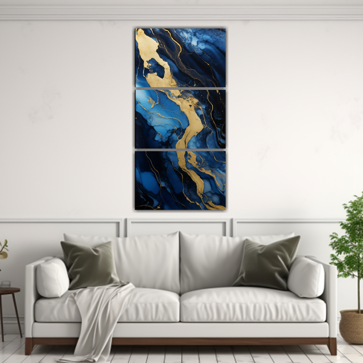 Este set de 3 cuadros en tonos Azul Zafiro y Gris es ideal para crear un punto focal en tu sala de estar Colócalos juntos en una pared principal para lograr un impacto visual máximo Combínalos con muebles en tonos neutros para un contraste elegante y moderno