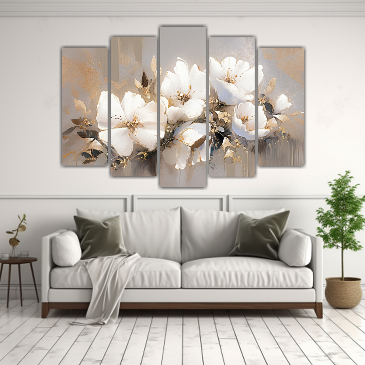 Renueva tu hogar con este set de 5 cuadros minimalistas en blanco y oro con flores en lienzo Ideal para crear un ambiente elegante y sofisticado Aprovecha la mejor calidad y los precios más bajos del mercado