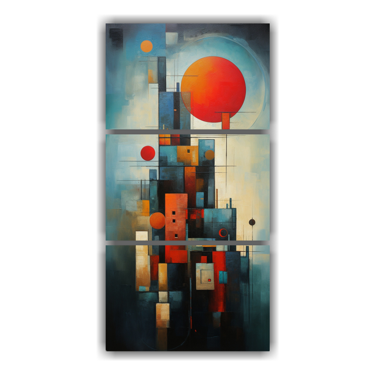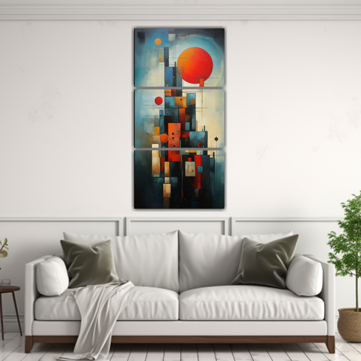 Este set de 3 canvas de colores plateado, azul marino grisaceo, gris, dorado, carmesí y coral es perfecto para decorar tu sala de estar Puedes colocarlos en una pared blanca para crear un contraste llamativo y moderno, o combinarlos con muebles en tonos neutros para lograr un ambiente elegante y sofisticado También puedes distribuirlos de manera horizontal para dar una sensación de amplitud y equilibrio ¡No dudes en experimentar y jugar con la disposición de los cuadros para encontrar la combinación perfecta que se adapte a tu estilo y personalidad!