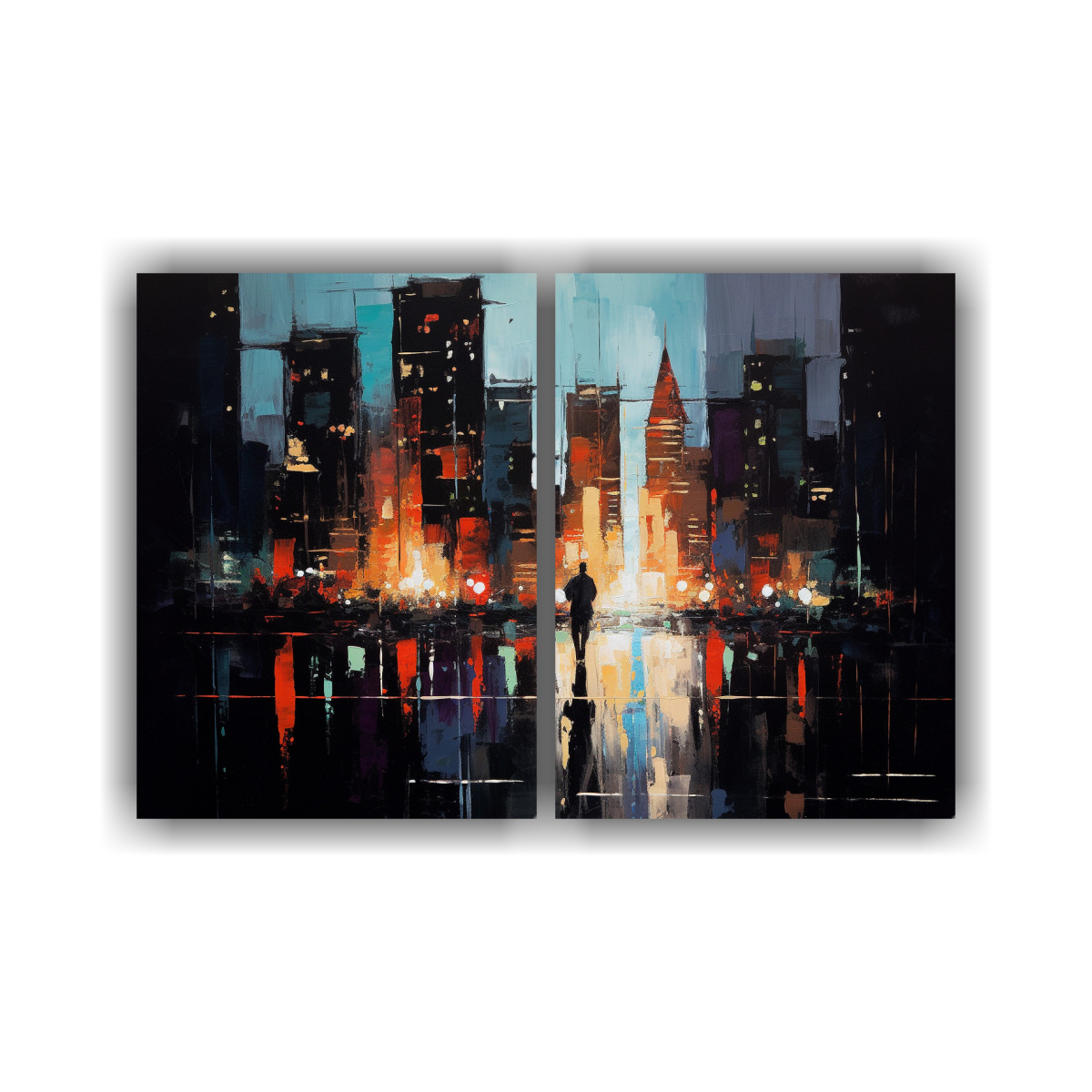 Renueva tu hogar con los Set 2 Lienzos Moderno Colores Vibrante Cityscape black background pale en DecoCuadros Entregas rápidas y gratuitas en Santiago, envíos express a regiones Añade un toque de elegancia con estos cuadros vibrantes