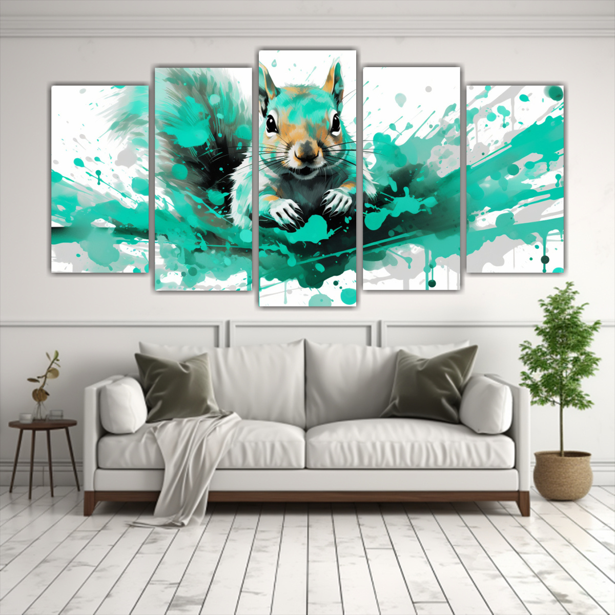 Este cuadro de Cuadros Modernos de Squirrels en Colores Menta y Ónix sería ideal para colocar en una pared principal de la sala de estar, creando un punto focal único Combínalo con muebles en tonos neutros para resaltar su vibrante paleta de colores ¡Destaca tu estilo con este diseño exclusivo de DecoCuadros!