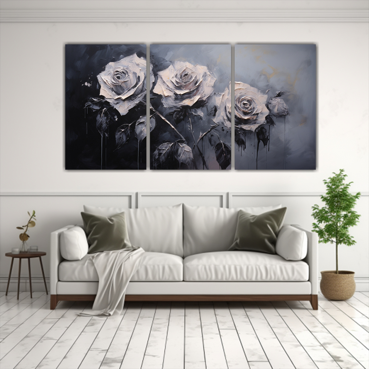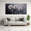 Decora con estilo usando un cuadro moderno de rosas negras en lienzo estilo Tres Canvas con tonos Plateado, Azul Marino grisaceo, Gris y Lila En DecoCuadros encuentras calidad y precios económicos