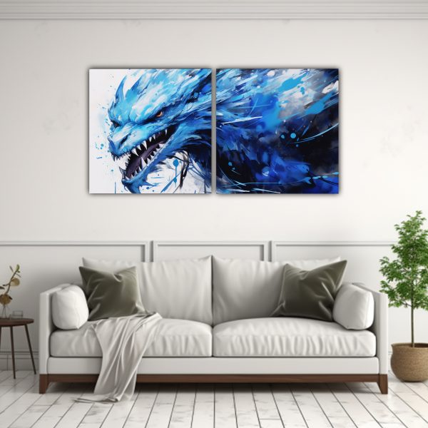 Para resaltar la presencia del cuadro ‘Dragón Azul en Estilo Neonoir’, colócalo en una pared de tonos neutros como blanco o beige Complementa con muebles en tonos grises y accesorios en coral o turquesa para crear un ambiente enigmático y moderno