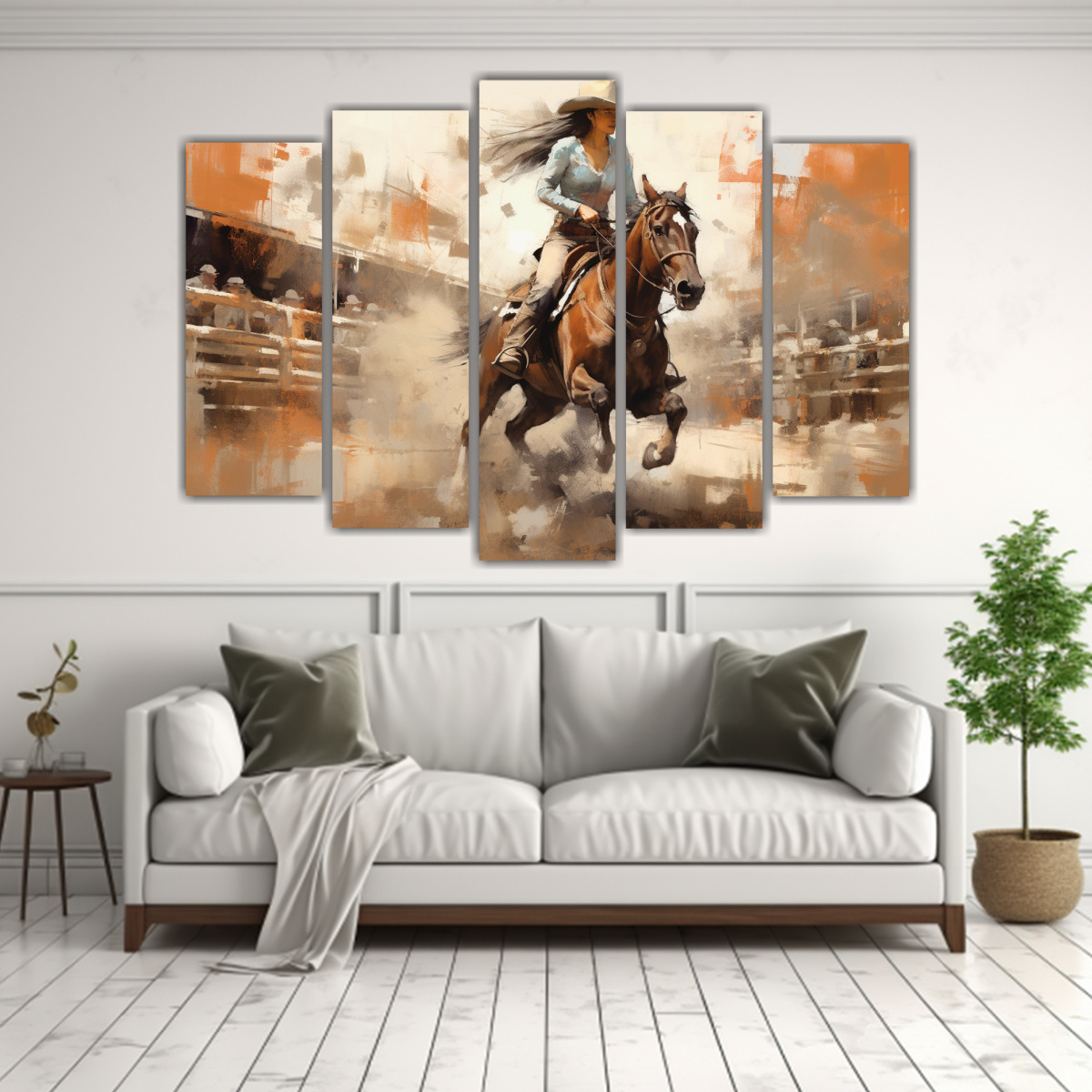 ¡Renueva tus espacios con este cuadro único! La combinación de colores y la energía de la mujer en la carrera de barriles le darán un toque dinámico a tu sala de estar, dormitorio o estudio Atrévete a colocarlo en una pared principal para resaltar su belleza