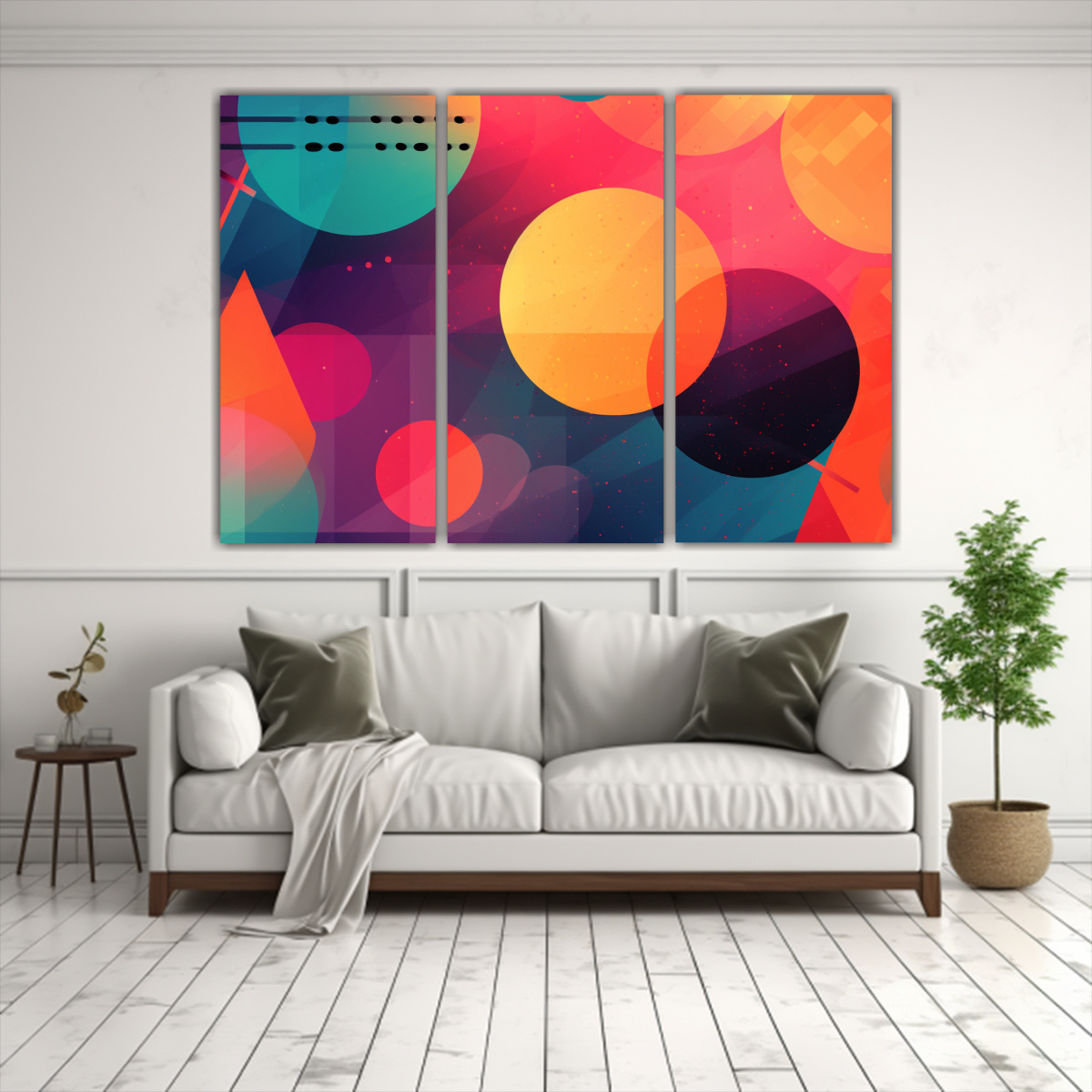 Este conjunto de tres lienzos coloridos y geométricos es perfecto para decorar el área sobre un sofá en una sala moderna Combínalos con cojines en tonos neutros y una alfombra de pelo corto para lograr un ambiente equilibrado y vanguardista