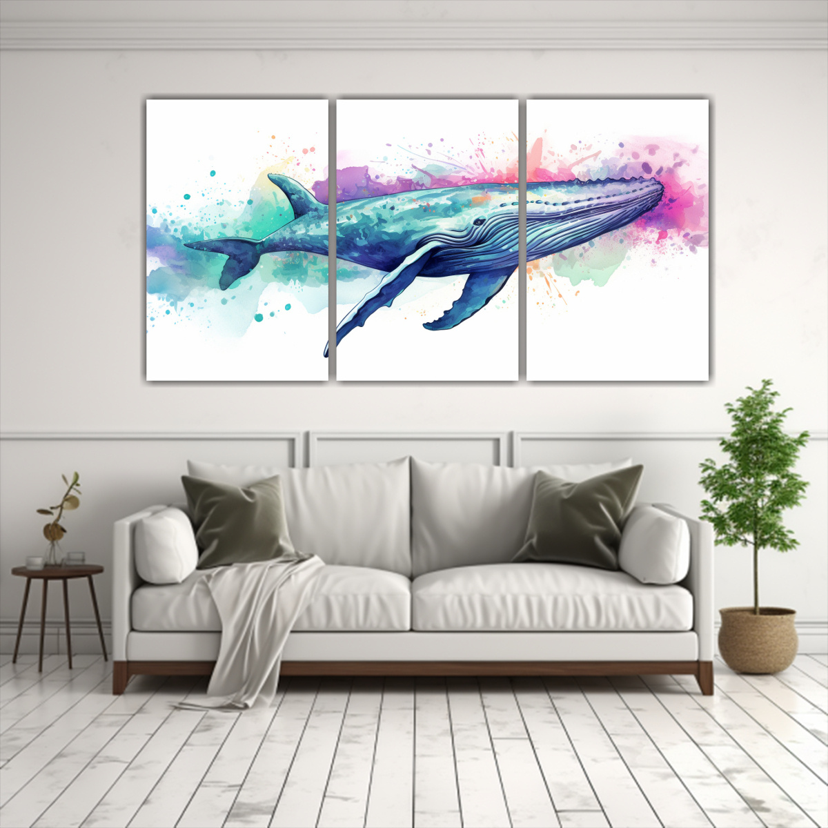 El set de 3 telas en bastidor de madera con diseño neo pop presenta una ballena azul en un paisaje de lavanda y colores acuamarinos Aprovecha nuestras entregas rápidas y gratuitas en Santiago, con envíos express a regiones Renueva tu decoración con estilo y originalidad