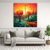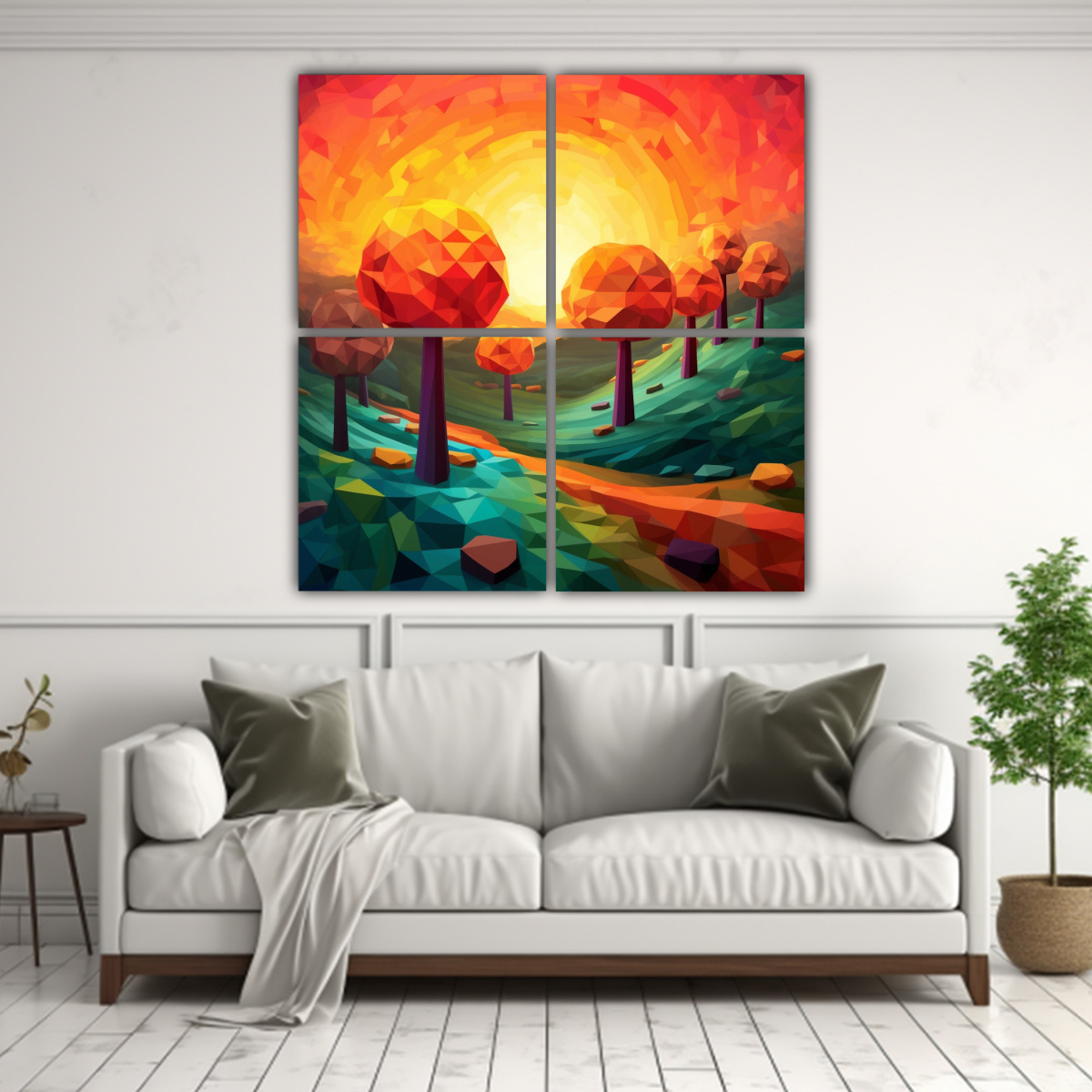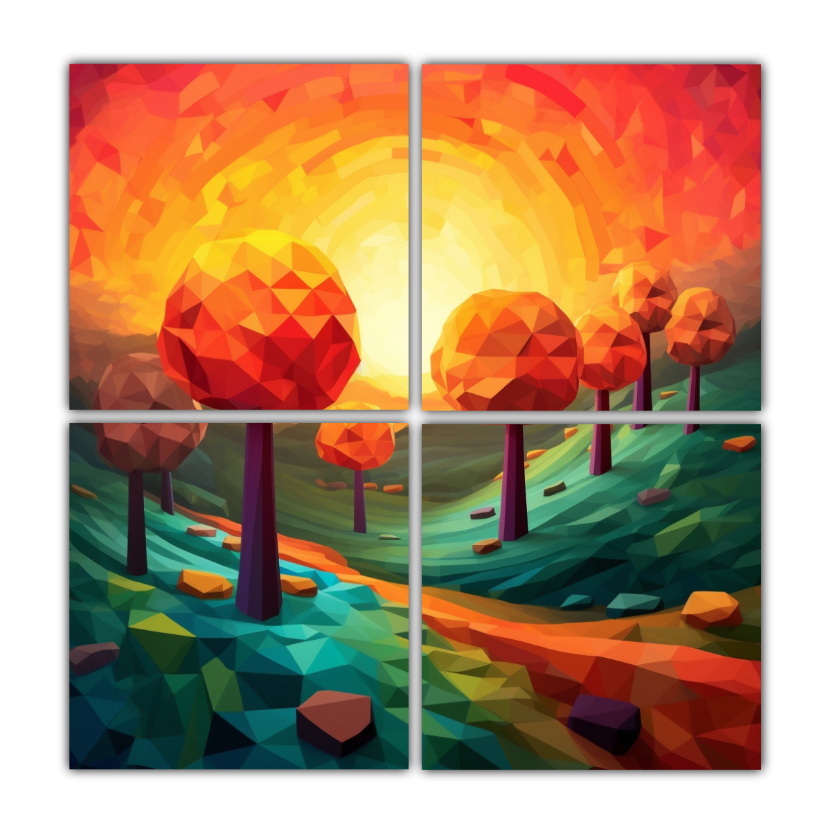 Este cuadro de árboles en estilo low poly encajaría perfectamente en un salón o estudio moderno Puedes colocarlo sobre un sofá gris claro para resaltar los colores vivos del cuadro Complementa la decoración con cojines en tonos similares y una alfombra en tonos neutros ¡Crearás un ambiente sofisticado y contemporáneo!