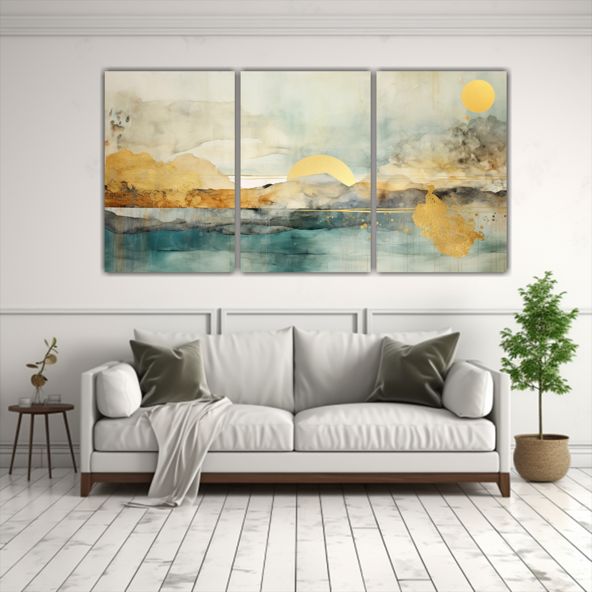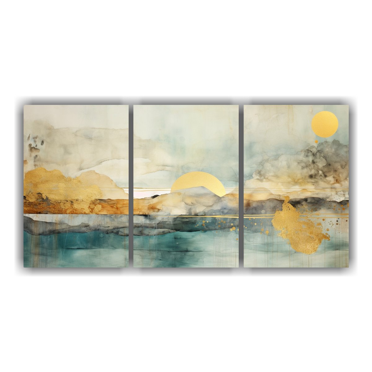 Agrega un toque de sofisticación a tus paredes con los Set 3 Cuadros Movimiento Exposición en tonos dorados, turquesa y plateado Calidad y precios económicos en DecoCuadros