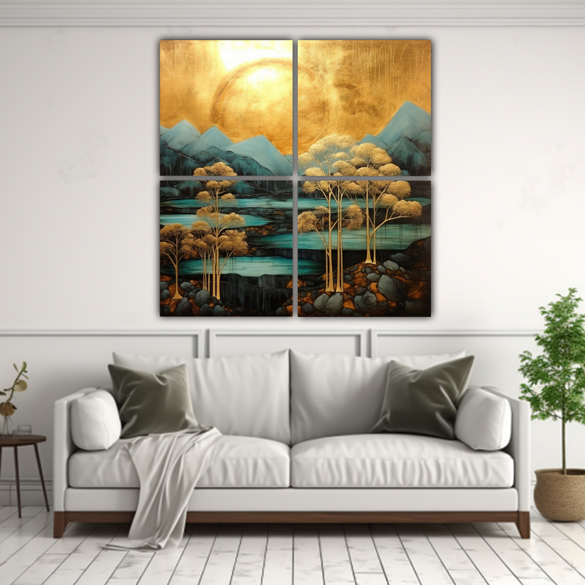 Coloca el Cuadro Movimiento Profundidad 2127 con paisaje en dorado de fondo en tu sala de estar para crear un ambiente elegante y sofisticado Combínalo con muebles en tonos neutros como beige o gris para resaltar su belleza ¡Será el centro de atención de tu decoración!