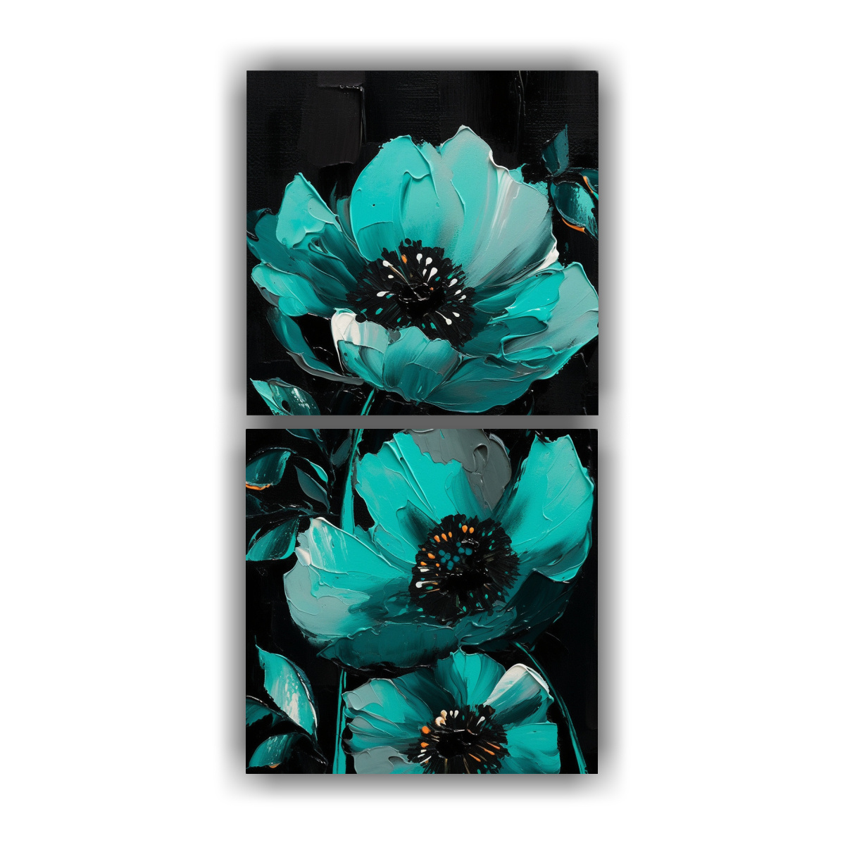 Cuadros Movimiento Temática Turquesa Y Negros Flores En Lienzo Set De 2