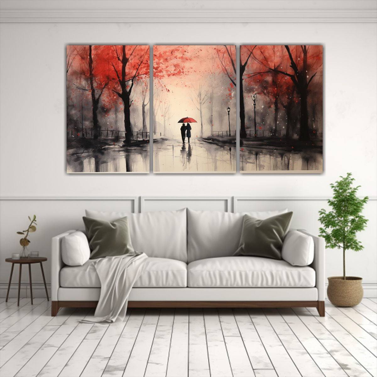 DecoCuadros ofrece cuadros multicolores de personas caminando bajo la lluvia con árboles y paraguas rojos Impresos en tela de alta calidad con bastidores de madera, nuestros cuadros tienen diseños exclusivos y los mejores precios del mercado Envío rápido y gratuito en Santiago, con envíos express a regiones