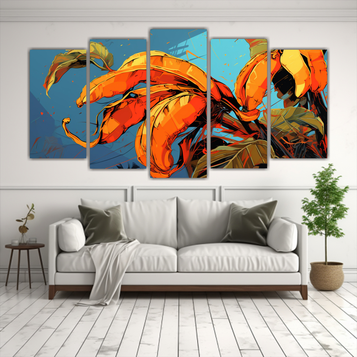 Este cuadro con un Árbol de Plátano en Colores Naranjas sería perfecto para decorar el salón o la sala de estar Colócalo sobre una pared de tonos neutros, como beige o blanco, para crear un contraste vibrante y sofisticado Combínalo con muebles de madera oscura y accesorios en tonos cálidos para lograr un ambiente acogedor y elegante ¡Dale vida a tu sala con este impresionante cuadro!