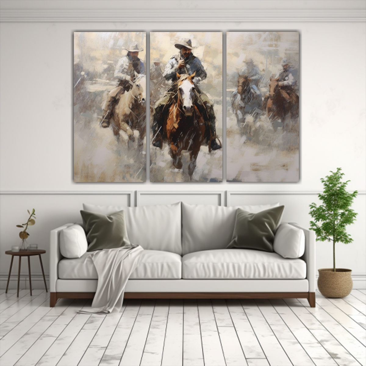 Este Cuadro Patron intenso de Vaqueros a caballo en Estilo Estilo óleo impresionista se vería perfecto en la sala de estar sobre un sofá de tonos neutros, creando un punto focal impactante Combínalo con cojines en tonos azules y grises para una decoración armoniosa