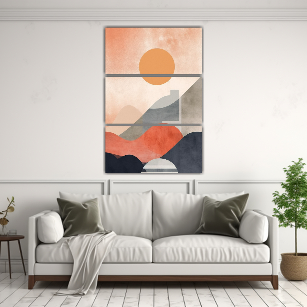 Este cuadro minimalista en estilo acuarela en tonos plateado, azul marino grisaceo, coral, gris y beige sería perfecto para decorar tu sala de estar Colócalo sobre el sofá para crear un ambiente elegante y relajante Combínalo con cojines en tonos neutros y una alfombra de pelo largo para brindar calidez al espacio