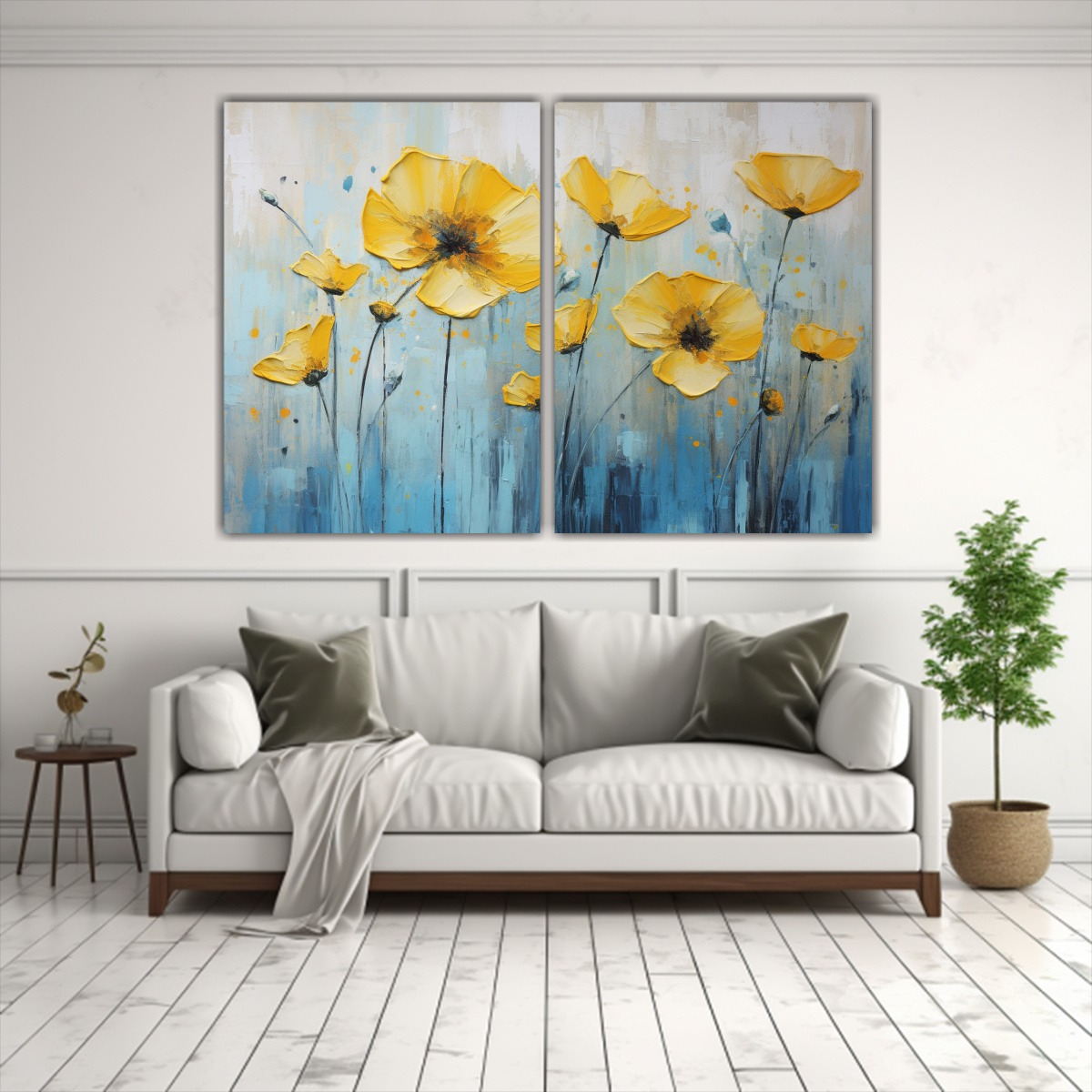 Cuadros Tela Abstractos Amarillo Y Azul Decoración Flores.