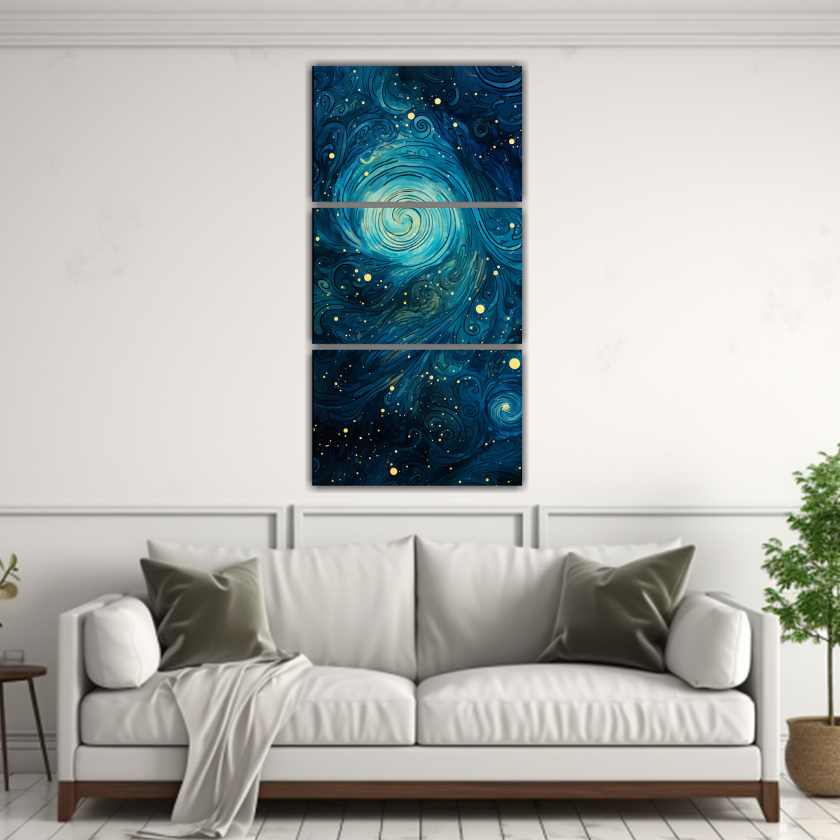 Este tríptico abstracto en azul profundo es perfecto para decorar tu sala de estar Colócalo sobre un sofá de color neutro para resaltar sus tonos azules, plateados y turquesas ¡Aportará un toque de elegancia y modernidad a tu espacio!