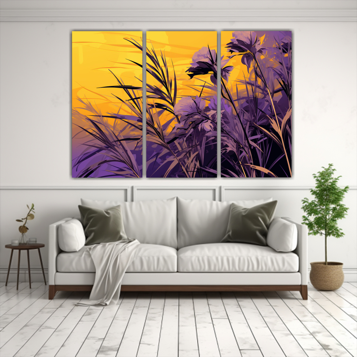 Este Cuadro Tela Fantasía en Amarillo y Morado quedaría ideal en el salón, sobre un mueble de color blanco para resaltar su belleza y contraste Combínalo con cojines en tonos grises y dorados para crear armonía en la decoración de tu sala de estar