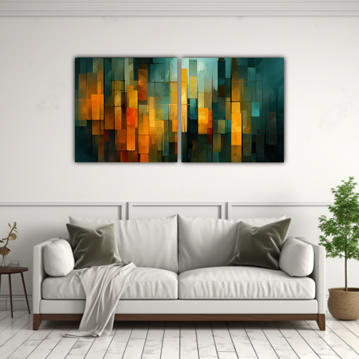 DecoCuadros presenta sus Cuadros Tela Sublimada Modernidad con Rectángulos Superpuestos, una serena composición de rectángulos superpuestos en colores Mostaza, Chocolate, Azul Marino grisaceo, Turquesa, Dorado, Plateado, Carmesí, Menta Hechos con tela de alta calidad y bastidores de madera Diseños exclusivos y entrega rápida