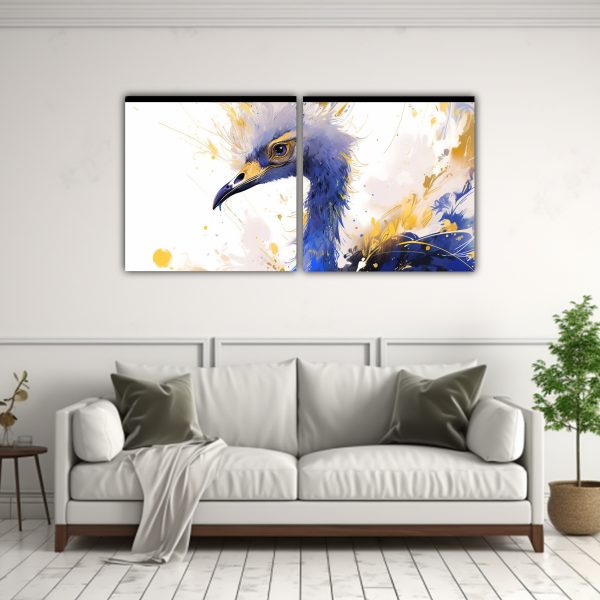 Este cuadro Poder Avestruz en Oro y Azul sería ideal para destacar en un salón moderno Colócalo sobre un mueble oscuro para resaltar sus colores y combínalo con cojines en tonos grises y plateados para crear un ambiente sofisticado y elegante