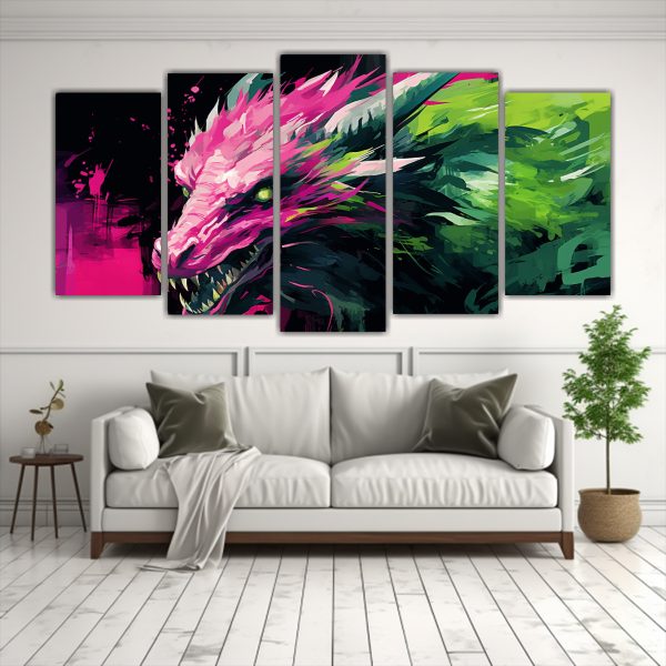 Este cuadro tonos modernos dragón verde y rosa se vería espectacular en la sala de estar, creando un contraste elegante con muebles de tonos neutros como blanco o gris También puedes colocarlo en el dormitorio para darle un toque de color y estilo único a tu espacio de descanso