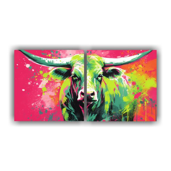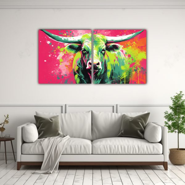 Descubre el arte neo pop art en este set de 2 telas en bastidor que capturan la esencia de una Longhorn Cow in Green AND Pink Colors Disfruta de los precios más económicos del mercado, entrega rápida y gratuita en Santiago y envíos express a regiones ¡Renueva tu decoración con estilo y originalidad!