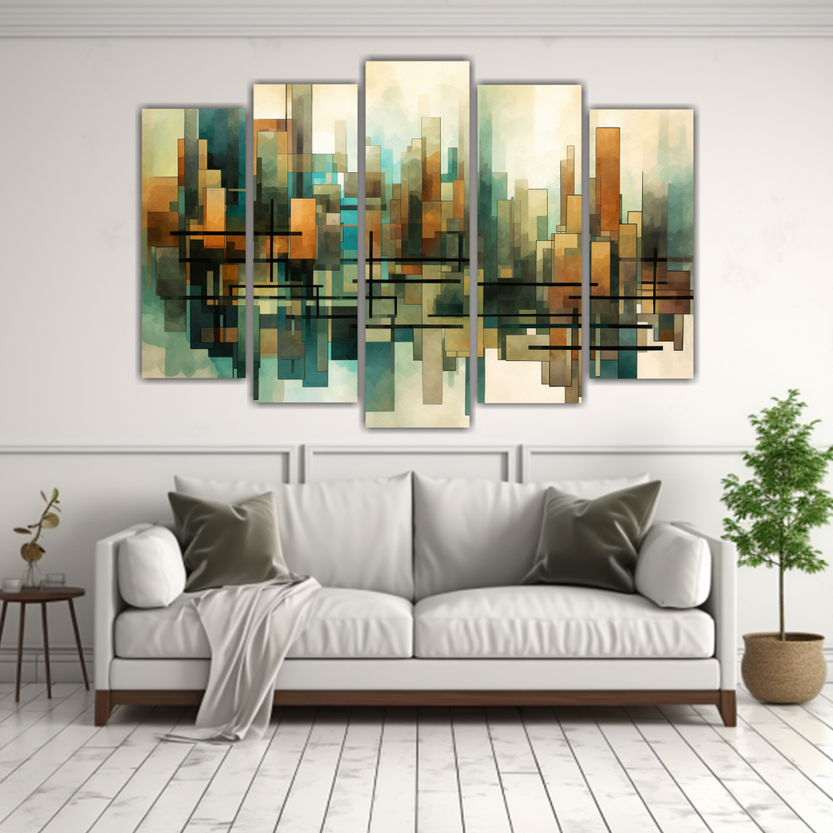 Este Cuadro Vanguardia Resistente en tonos de Azul Marino grisaceo, Beige y Turquesa sería ideal para colocar en una sala de estar moderna Combínalo con muebles en tonos neutros para resaltar su estilo urbano y darle un toque fresco a tu espacio