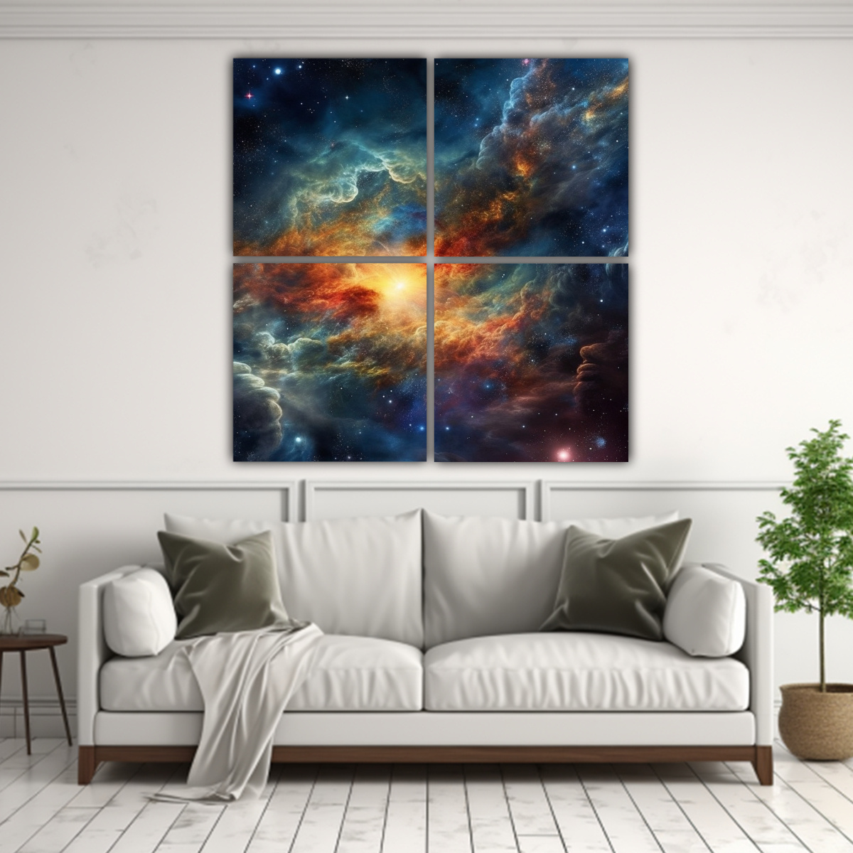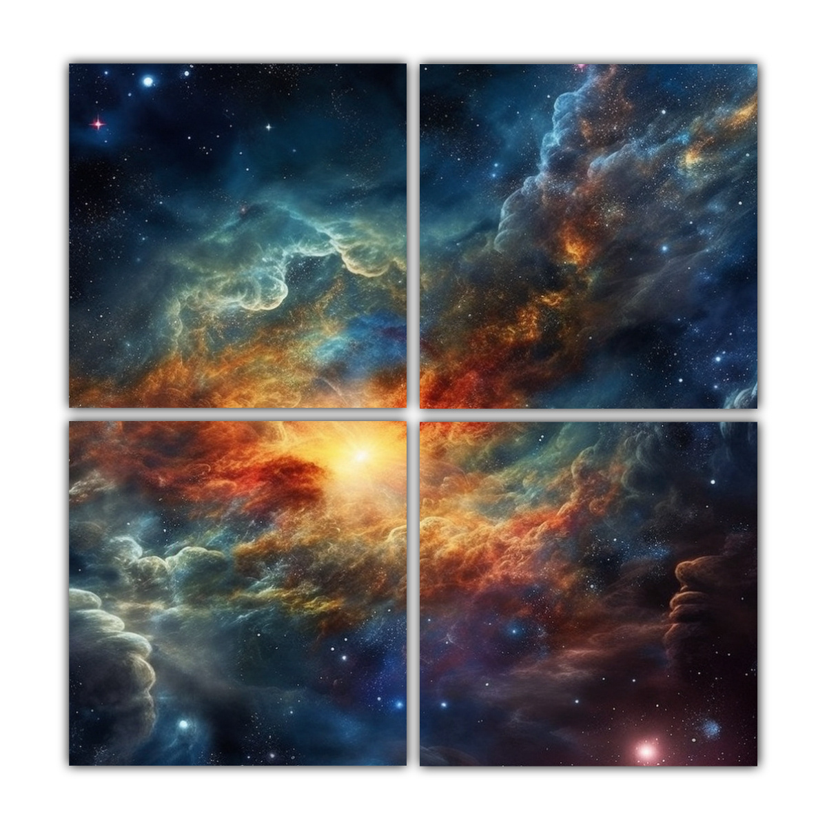 DecoCuadros te presenta el cuadro ‘Cuatro Artes Cálidos – Galaxias Cósmicas y Nebulosas’, una impresionante obra de arte que muestra la belleza del universo en tonalidades de coral, azul marino grisáceo, chocolate, gris, turquesa, negro y carmesí Añade un toque moderno y sofisticado a tu hogar con este cuadro de diseño exclusivo