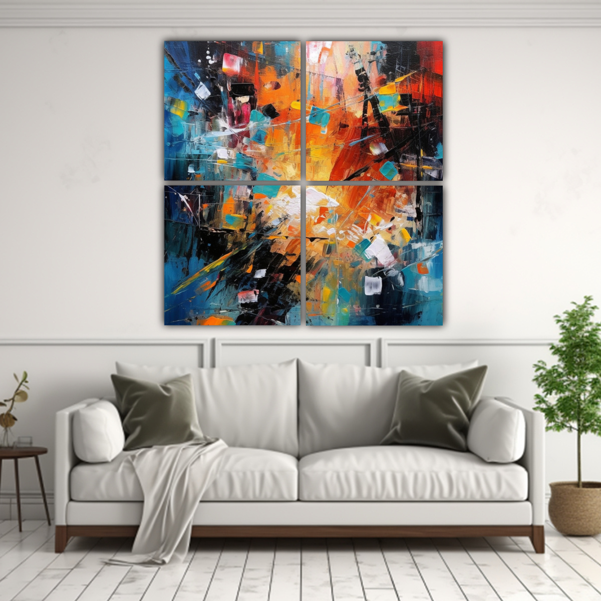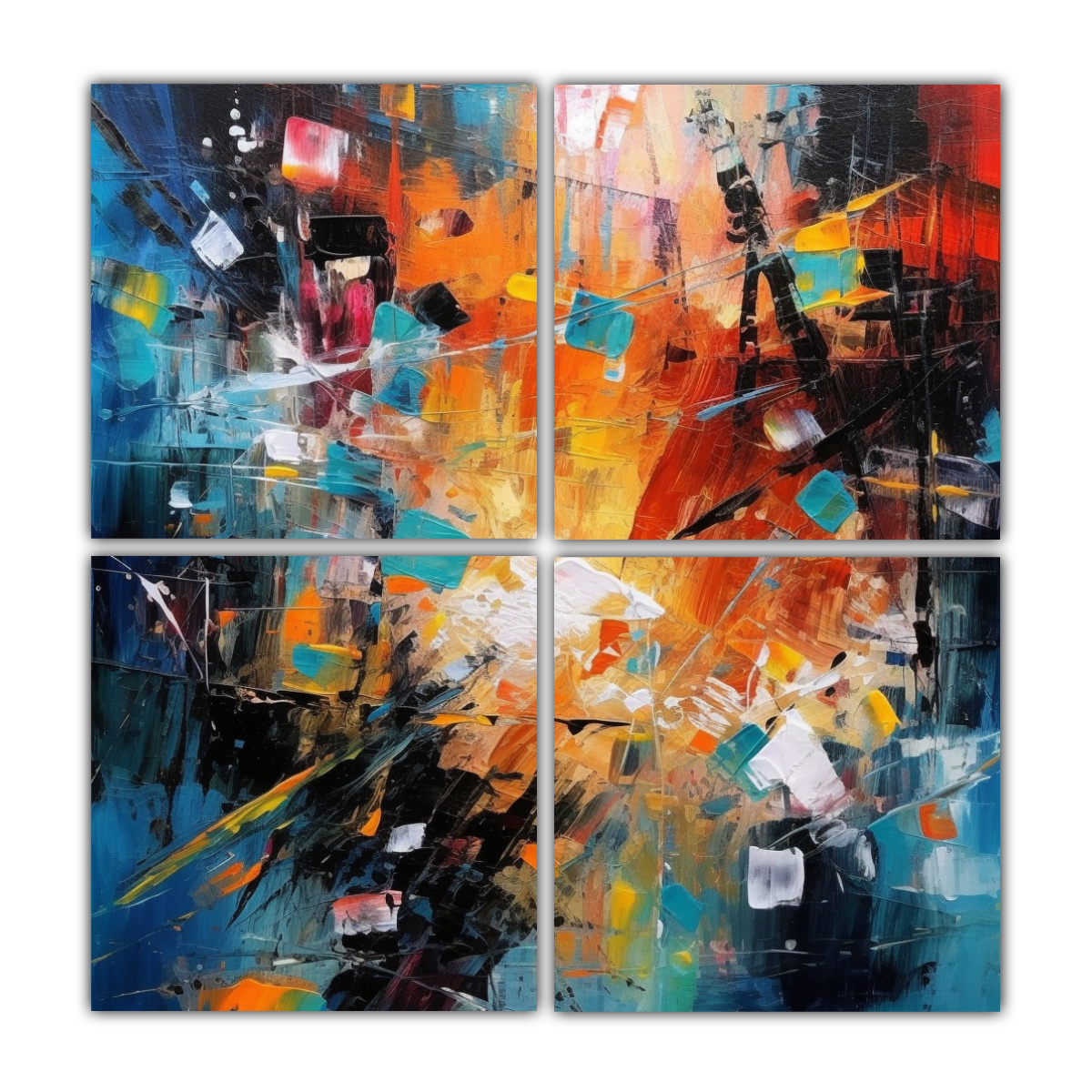 Este cuadro ‘Cuatro Artes Conceptual Intenso’ sería perfecto para decorar tu sala de estar o tu dormitorio Sus vibrantes colores, como el Coral, el Turquesa y el Menta, agregarán vida y energía a tus espacios Combínalo con muebles y accesorios en tonos neutros como el Gris y el Plateado para crear una atmósfera moderna y sofisticada ¡Atrévete a darle un toque de color a tu hogar con este cuadro único!
