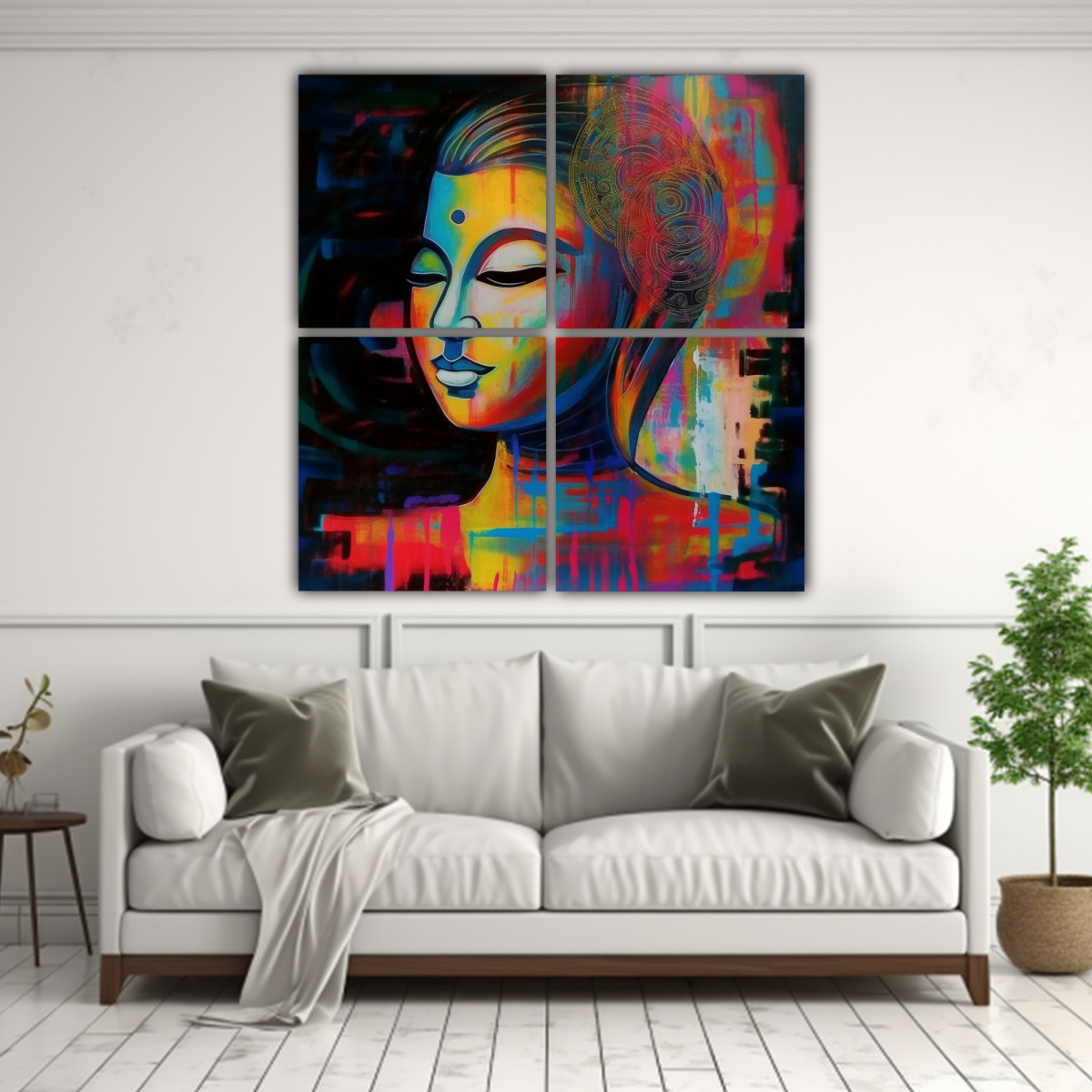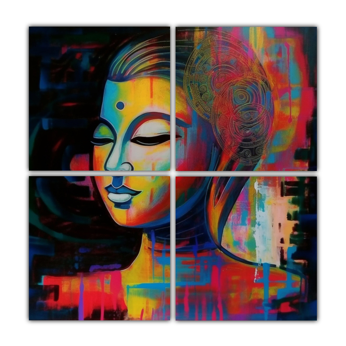 Decora tu hogar con el cuadro ‘Cuatro Artes de Pared Imagen Adorno colorful abstract acrylic art woman buddha’ de DecoCuadros Elige entre los colores Carmesí, Menta, Negro, Gris, Azul Marino Grisáceo, Plateado o Dorado Calidad y precios económicos garantizados