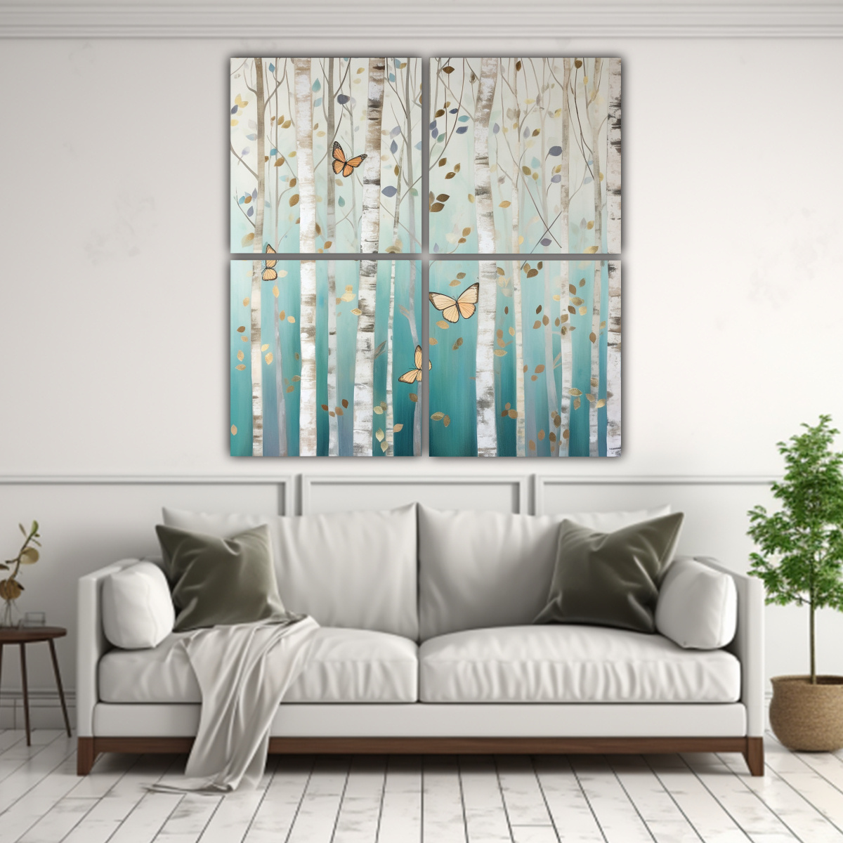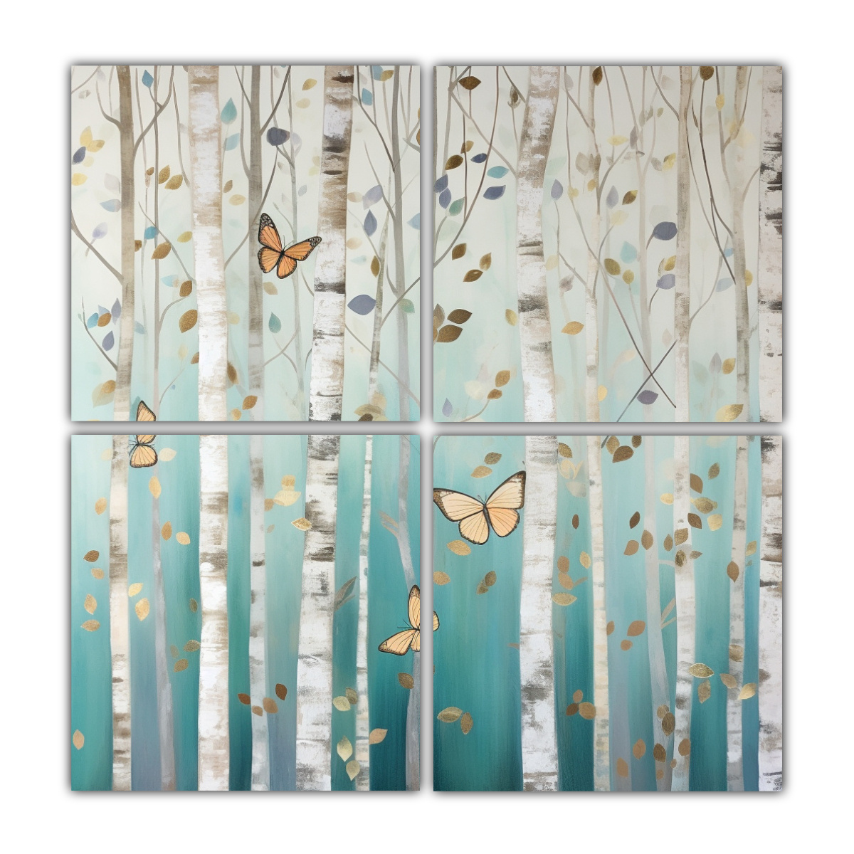 Este cuadro ‘Cuatro Artes Impreso Protagonismo: Alas de mariposa en abedules al estilo de serenidad tranquila’ quedará espectacular en tu sala de estar Colócalo sobre un sofá de tonos neutros, como beige o gris, y complementa la decoración con cojines en los colores plateado, verde azulado y turquesa Agrega unas plantas en macetas de cerámica gris y tendrás un ambiente tranquilo y relajante ¡No esperes más y decora tu hogar con estilo con DecoCuadros!