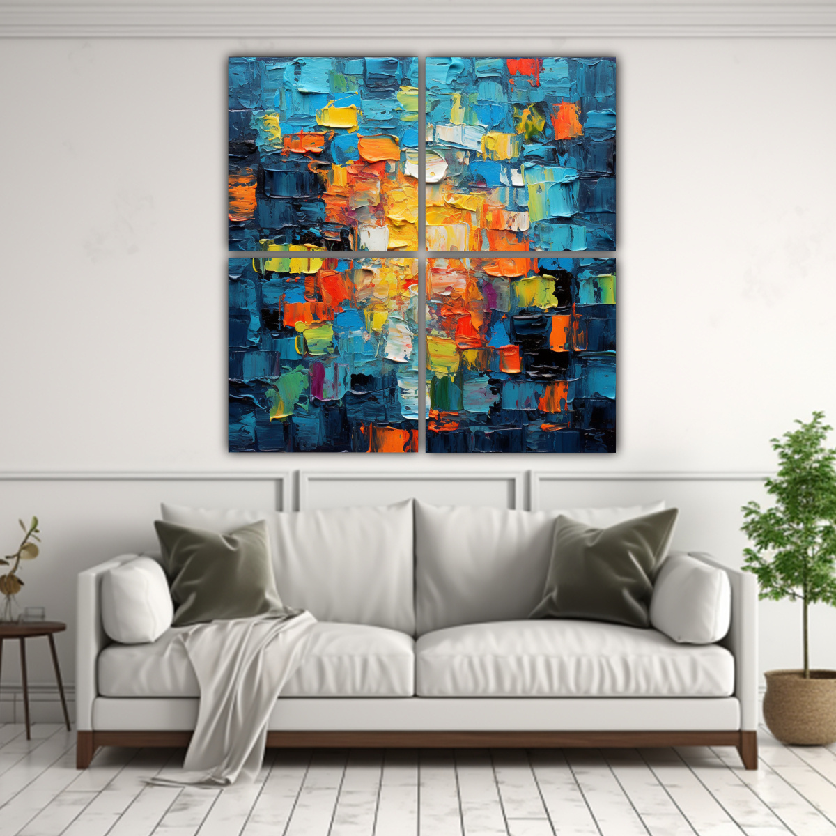 Este cuadro se vería hermoso en un salón moderno o en un dormitorio elegante Puedes colocarlo sobre un sofá gris claro para resaltar los colores vibrantes, o en una pared blanca para crear un contraste impactante Además, su estilo abstracto y colorido lo hace ideal para combinar con muebles de líneas simples y colores neutros