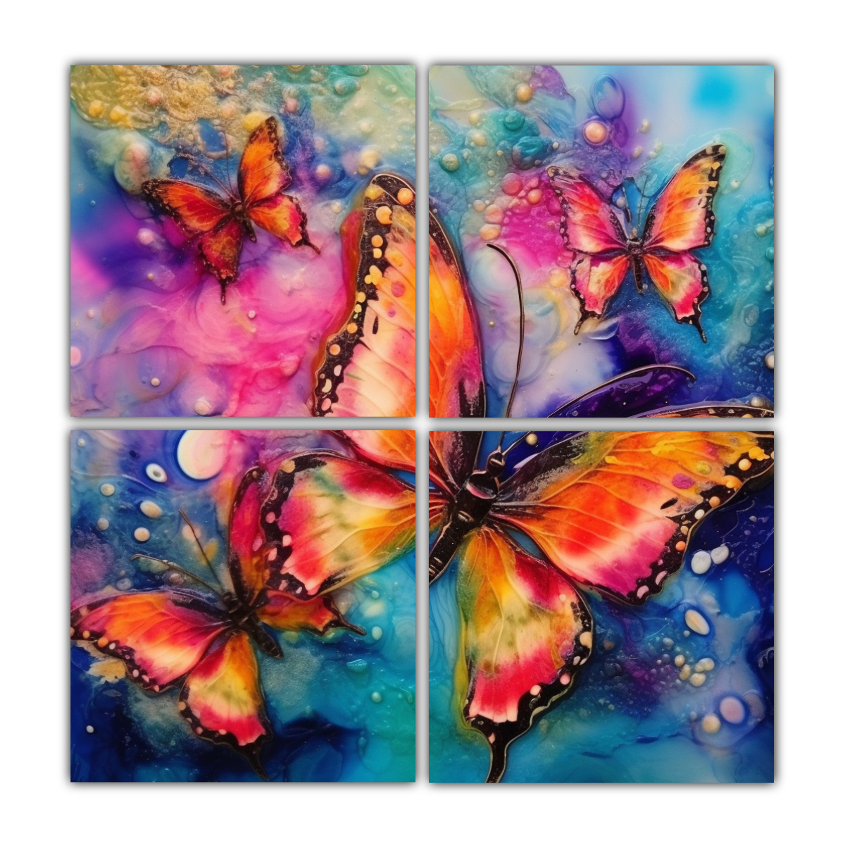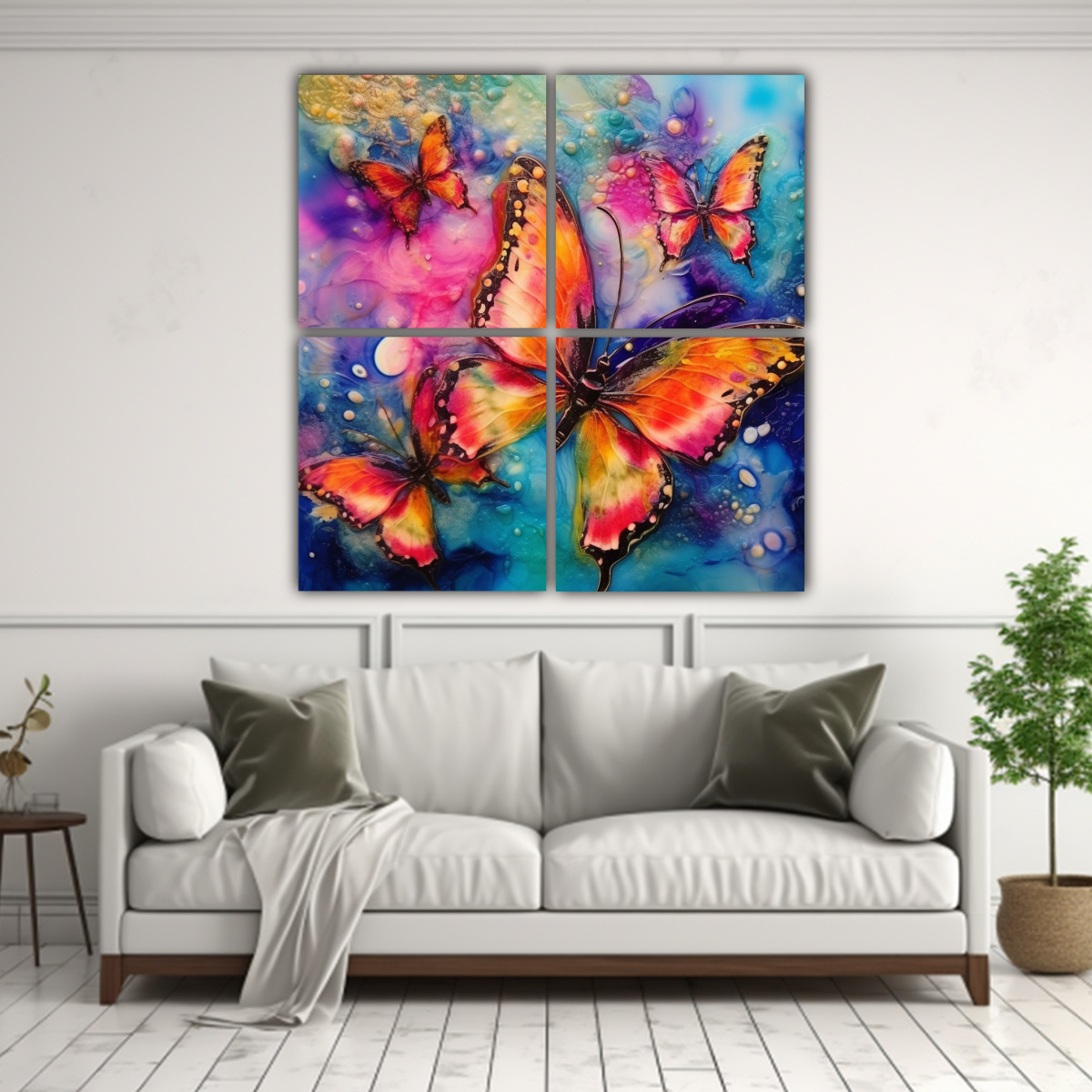 Cuatro Artes Moderno, Pintura Maestra Con Tintas Al Alcohol En Colores Neón, Mariposas Volando