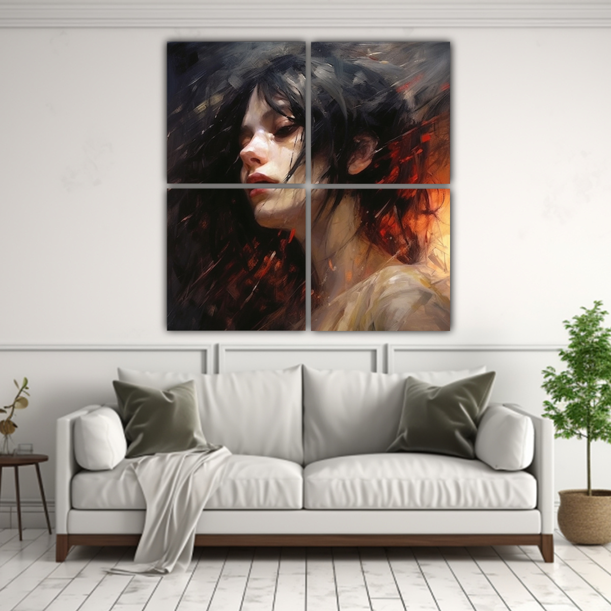 En DecoCuadros encontrarás la mejor calidad y los precios más económicos en cuadros decorativos impresos en tela de alta calidad Nuestro cuadro ‘Cuatro Artes: Pintura Vitalidad chica hermosa rostro lateral estilo horror como Estilo Estilo óleo’ combina los colores Coral, Azul Marino grisaceo, Gris, Beige y Carmesí para darle a tu espacio un toque vibrante y sofisticado