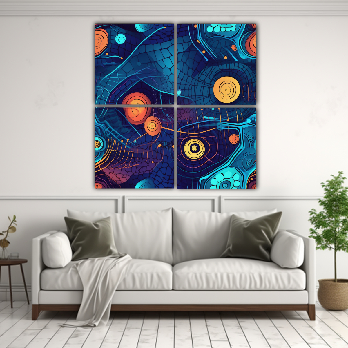 Coloca el Cuatro Composiciones Estilo Galería Elegancia colores llamativos en el salón de tu hogar para darle un toque elegante y moderno Combina perfectamente con un sofá de color blanco o gris, y una alfombra en tonos neutros Añade cojines en colores llamativos que resalten los tonos del cuadro ¡Una combinación perfecta para recibir a tus invitados con estilo!