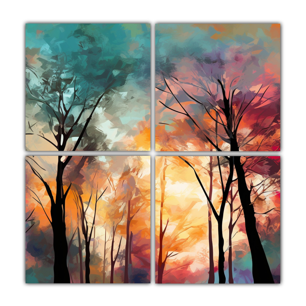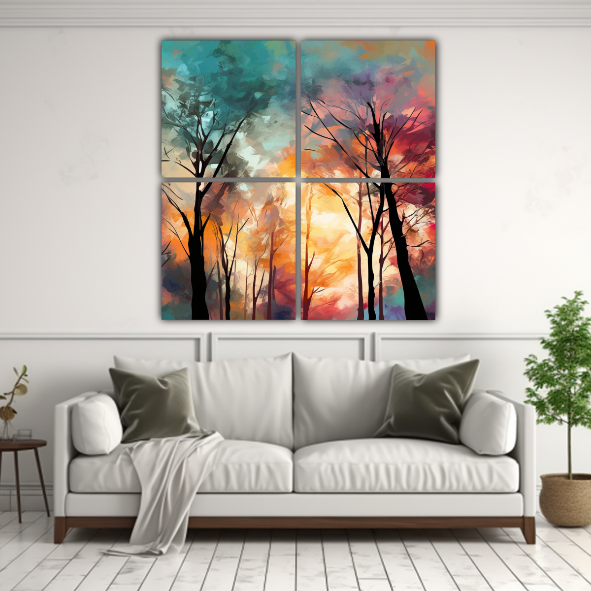 Cuatro Cuadros Abstractos De Árboles Con Colores Cálidos En Tela