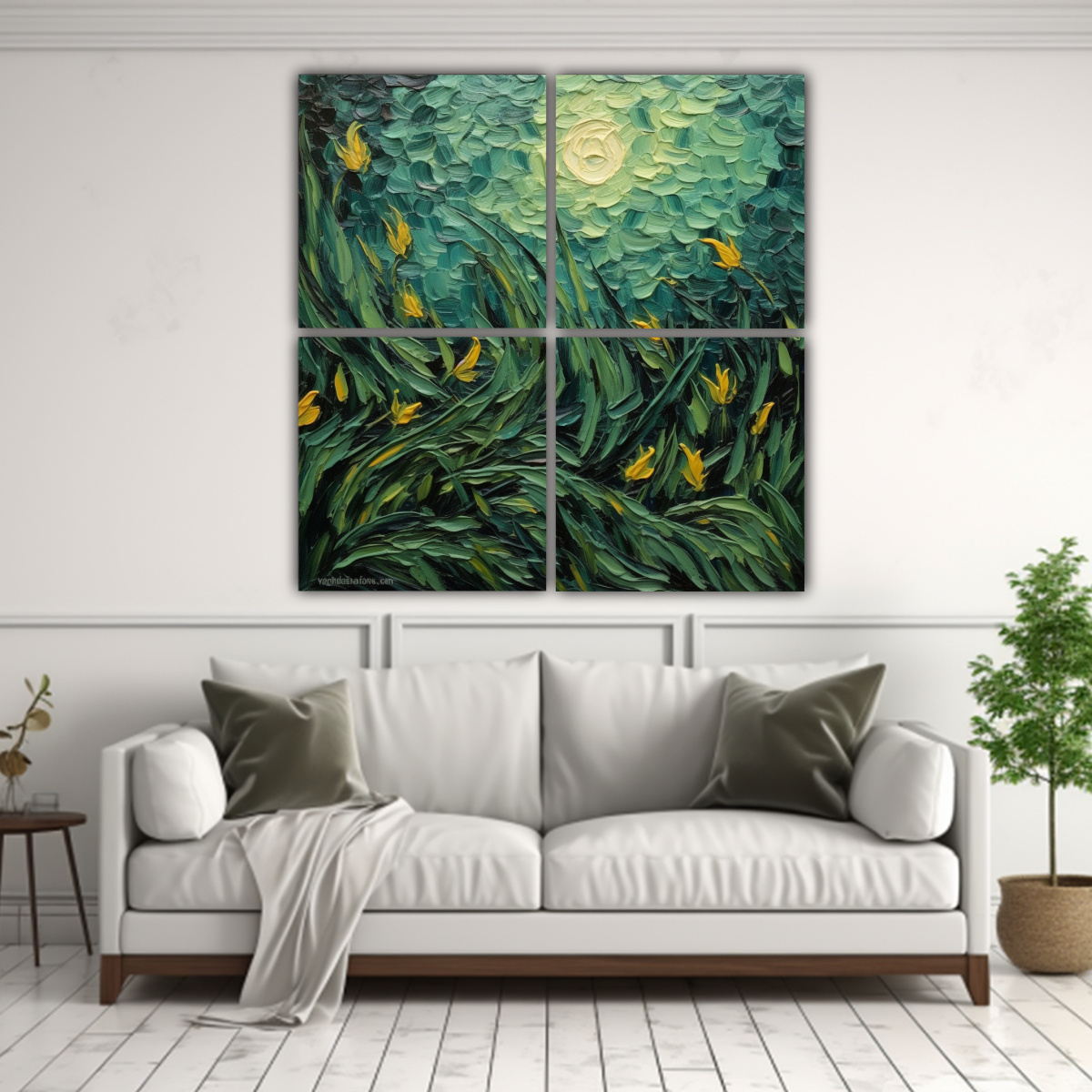 Cuatro Cuadros Concepto Protagonismo: Arte Inspirado En Van Gogh En Tono Verde Salvia.