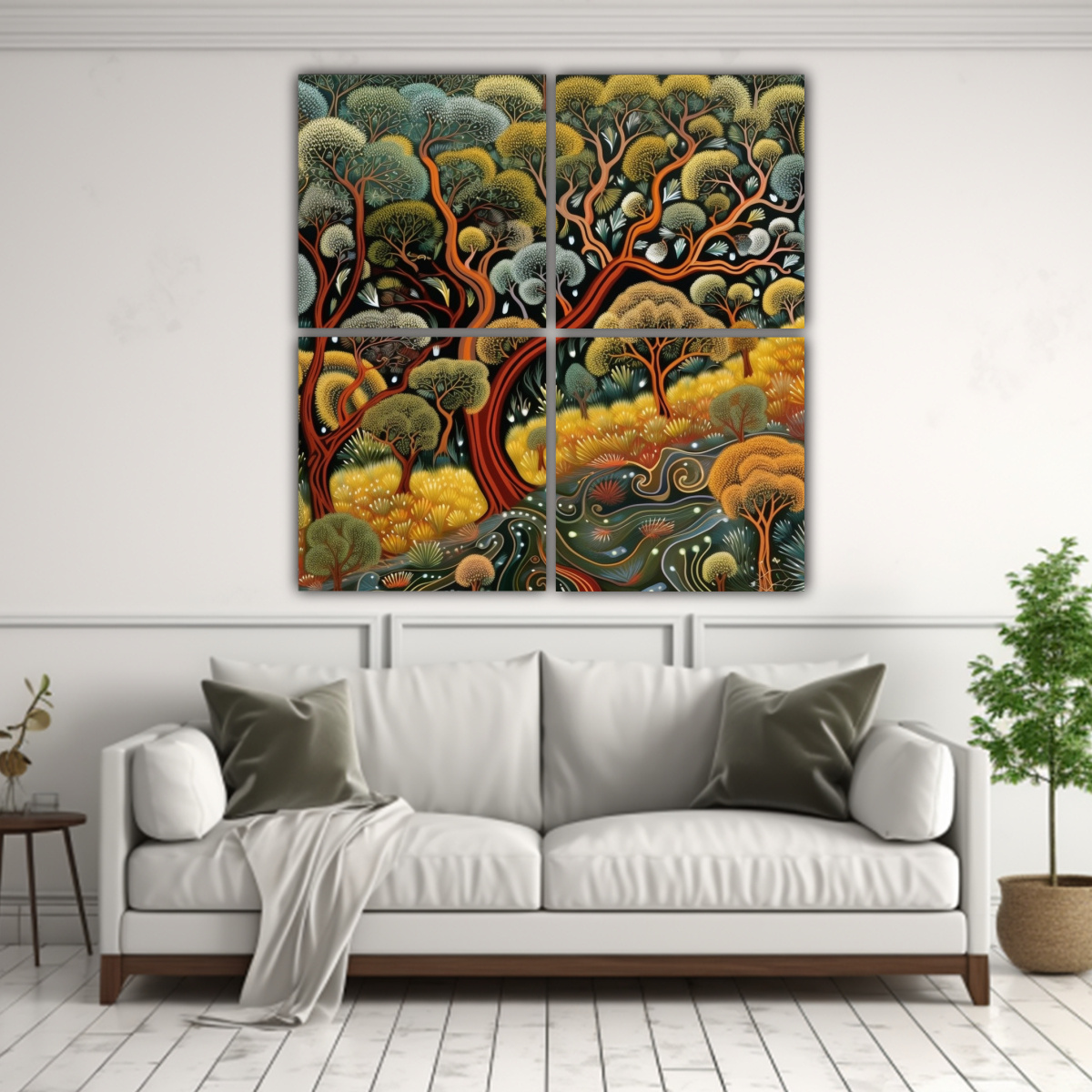 Cuatro Cuadros Modernos Urbanos En Bastidor Con Arte Aborigen En Fondo De Pantalla De Bosque 1117554457006