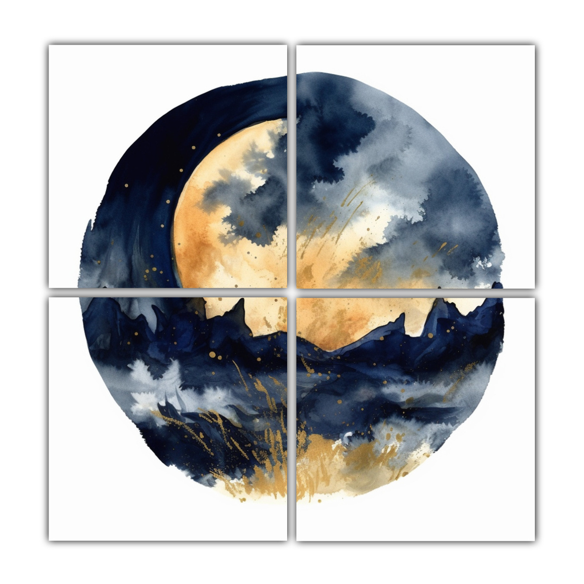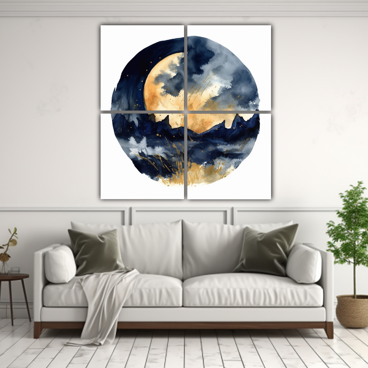 Cuatro Cuadros Tela Sublimada Watercolor Azul Marino Negro Oro Trazos De Pincel En Blanco.