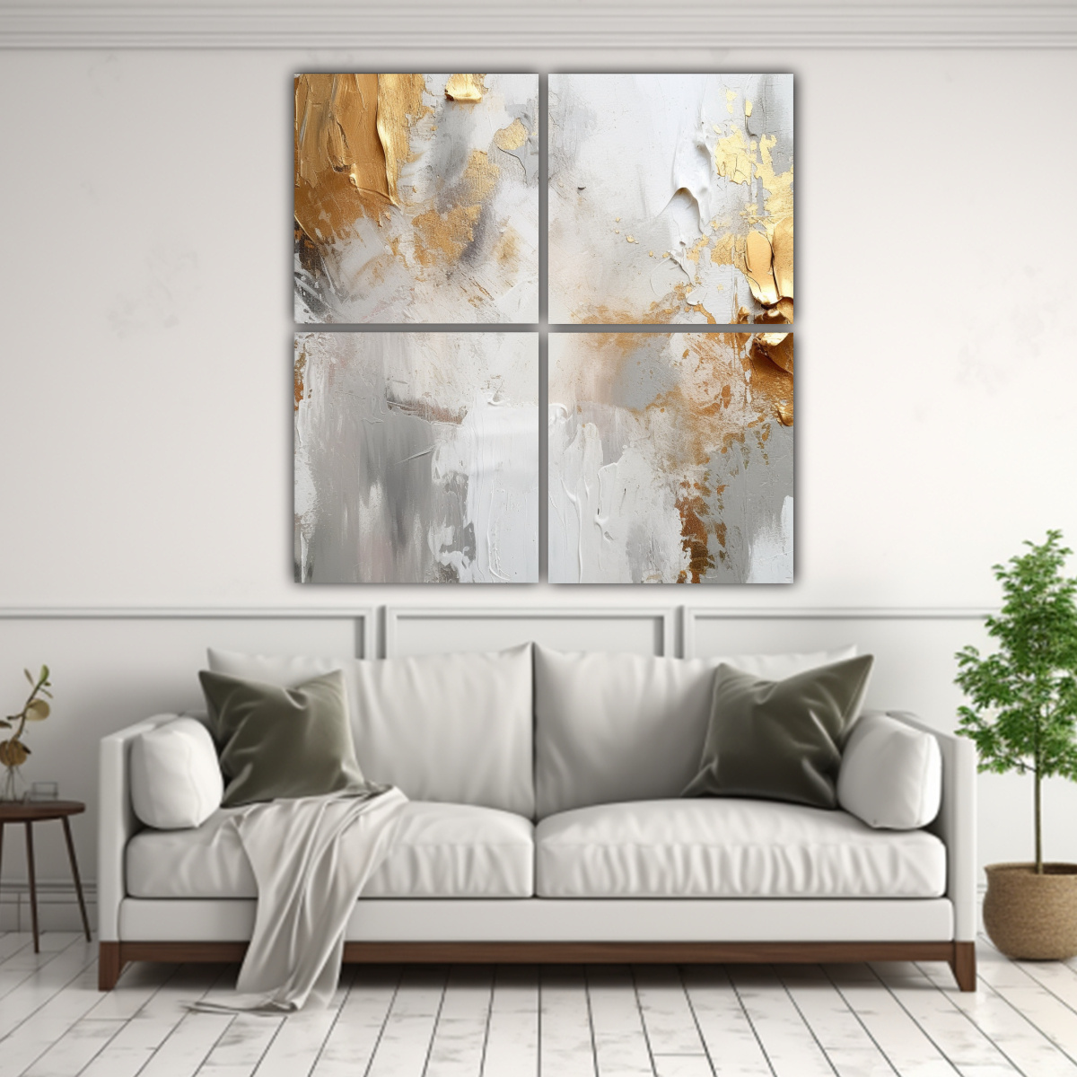 Cuatro Lienzos De Tela Abstractos Blancos Con Salpicaduras Doradas En Hermoso Fondo De Pintura Brillante