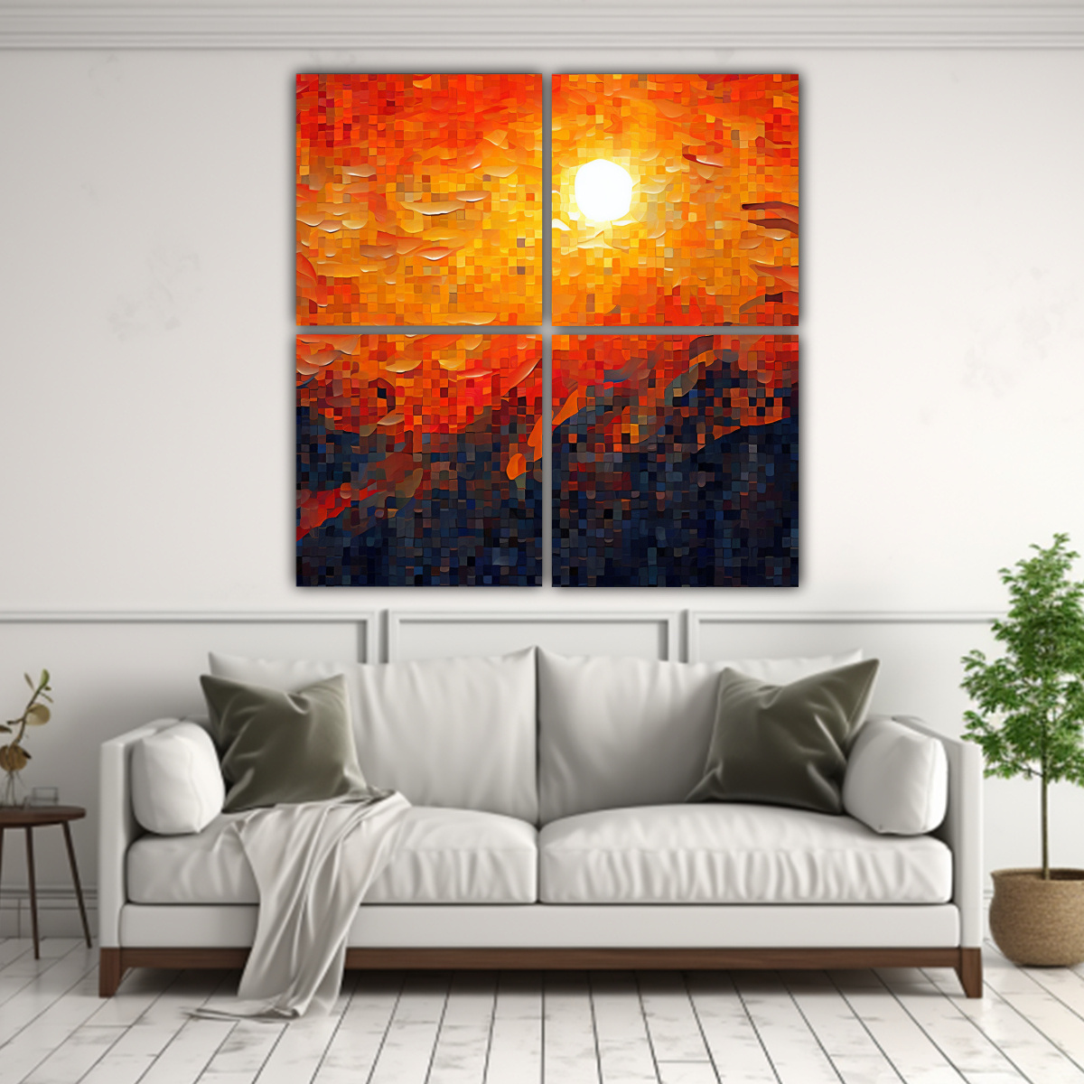 Este cuadro es perfecto para decorar un salón o sala de estar Combina muy bien con muebles de tonos neutros y detalles en dorado Coloca los cuatro lienzos en una pared amplia y lisa para resaltar su intensidad y crear un punto focal en la habitación También puedes agregar cojines y cortinas en tonos similares para lograr una armonía visual ¡Atrévete a darle un toque moderno y sofisticado a tu espacio con este cuadro de DecoCuadros!