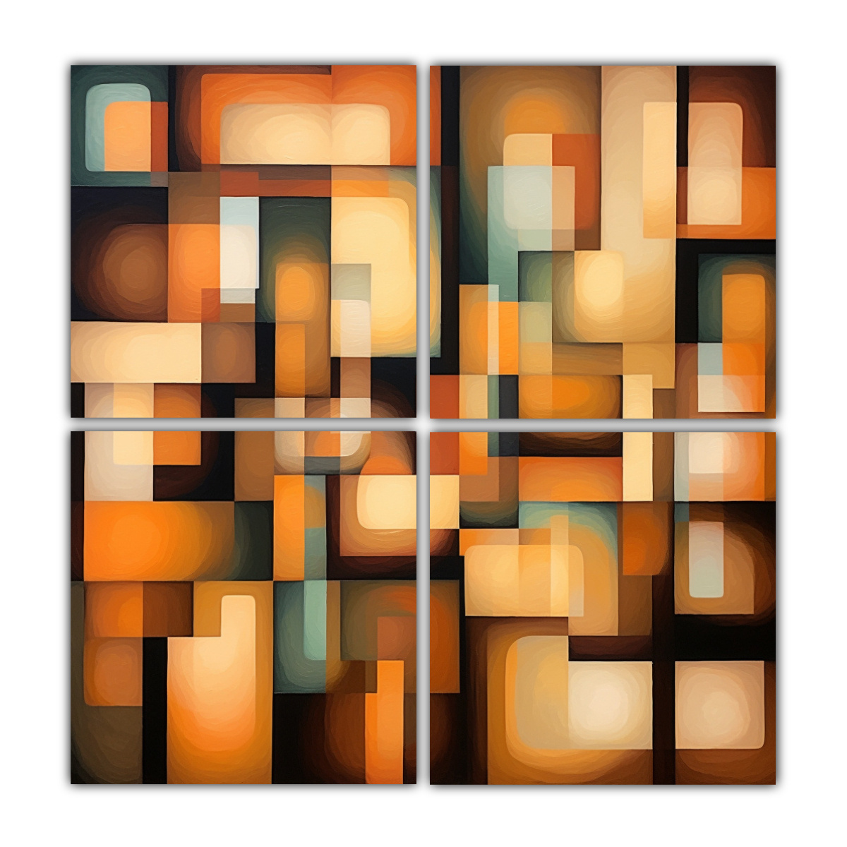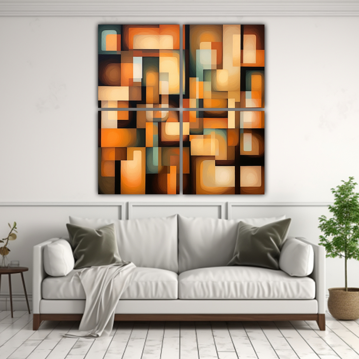 Estos cuatro lienzos abstractos geométricos quedarían perfectos en la pared principal de tu cuarto, justo encima de la cama Los tonos de coral, azul marino grisaceo, plateado, chocolate, amarillo claro y gris combinarán muy bien con una decoración moderna y minimalista Puedes complementarlos con cojines y cortinas en los mismos tonos para crear una armonía visual en el espacio ¡Atrévete a darle un toque de estilo y color a tu cuarto con estos hermosos cuadros!