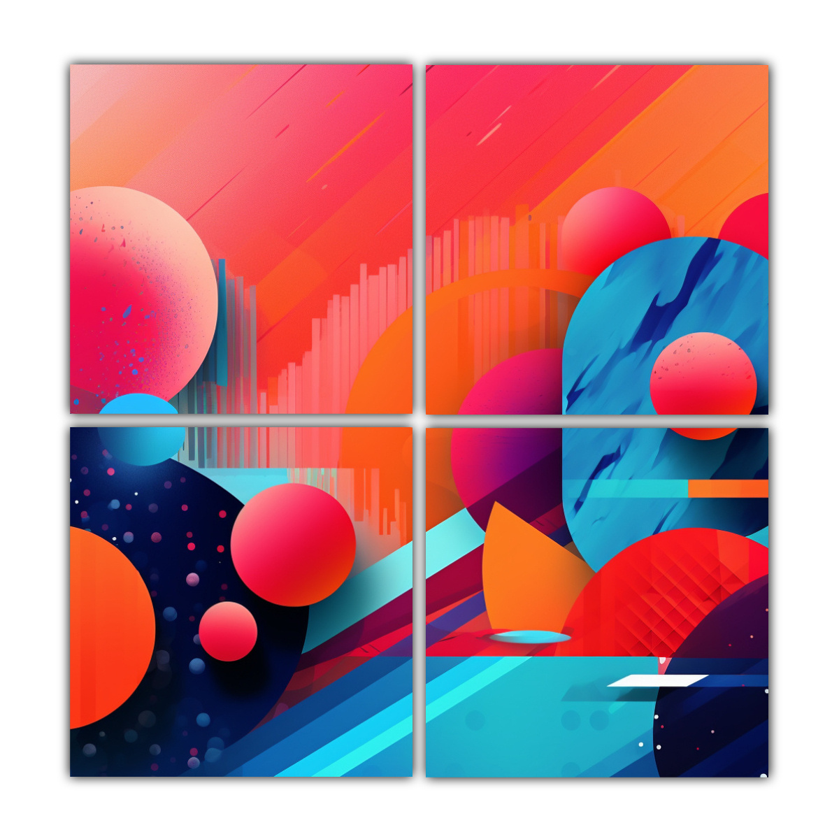 DecoCuadros ofrece cuatro lienzos de tela sublimada con elementos de fondo brillantes y elegantes en los colores Azul Marino grisaceo, Rojo, Turquesa, Verde Azulado, Plateado, Coral, Carmesí y Lila Añade un toque de estilo a tu hogar con estos cuadros de relación de aspecto 16:9
